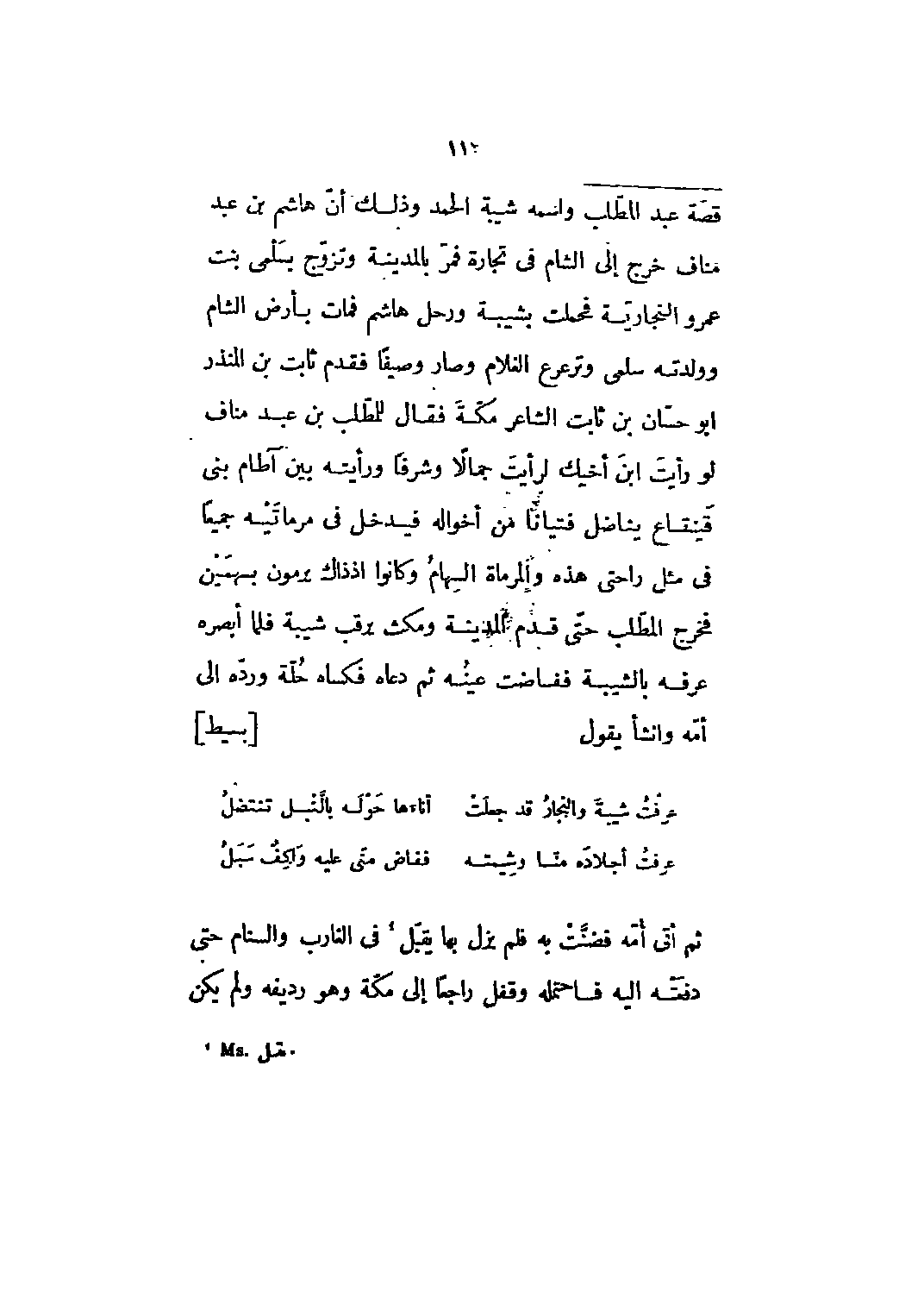 واسمه شيبة الحمد وذلك أنّ هاشم بن عبد مناف خرج إلى الشام في تجارة فمر بالمدينة وتزوج بسلمى بنت عمرو النجارية فحملت بشيبة ورحل هاشم فمات بأرض الشام وولدته سلمى وترعرع الغلام وصار وصيفا فقدم ثابت بن المنذر أبو حسان بن ثابت الشاعر مكة فقال للمطلب بن عبد مناف لو رأيت ابن أخيك لرأيت جمالا وشرفا ورأيته بنى آطام بنى قينقاع يناضل فتيانا من أخواله فيدخل في مرماتية جميعا في مثل راحتي هذه والمرماة السهام وكانوا إذ ذاك يرمون بسهمين فخرج المطلب حتى قدم المدينة ومكث يرقب شيبة فلما أبصره عرفه بالشيبة ففاضت عينه ثم دعاه فكساه حلة وردة إلى أمه وانشأ يقول [بسيط]