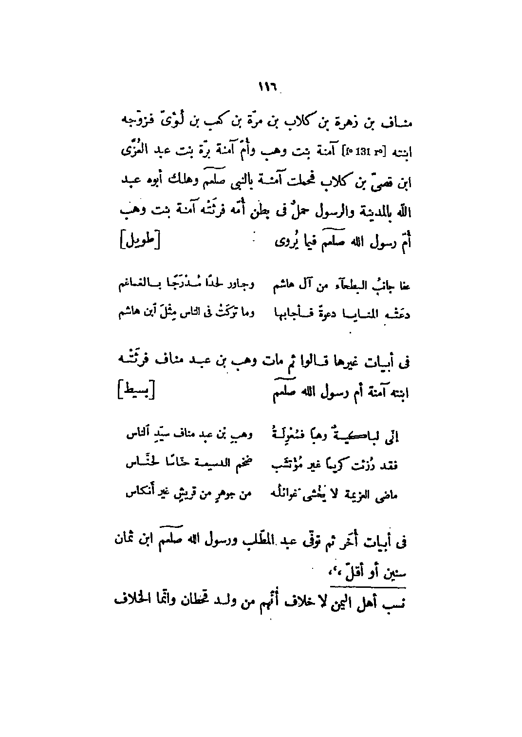 مناف بن زهرة بن كلاب بن مرة بن كعب بن لؤي فزوجه ابنته [F؟ 131 r؟] آمنة بنت وهب وأم آمنة برة بنت عبد العزّى ابن قصىّ بن كلاب فحملت آمنة بالنبيّ صلى الله عليه وسلم وهلك أبوه عبد الله بالمدينة والرسول حمل في بطن أمه فرثته آمنة بنت وهب أمّ رسول الله صلى الله عليه وسلم فيما يروى [طويل]