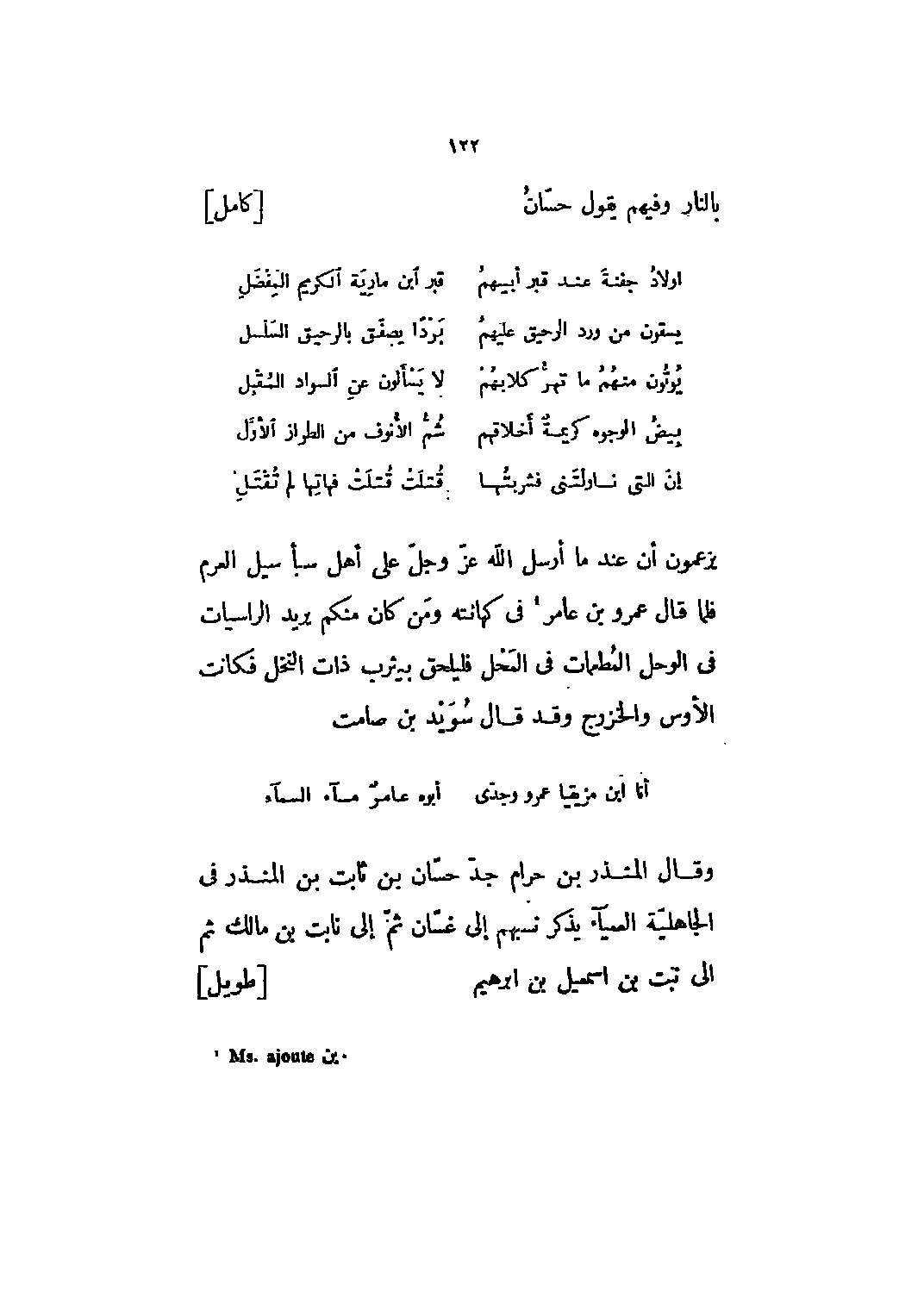 وقال المنذر بن حرام جد حسان بن ثابت بن المنذر في الجاهلية العمياء يذكر نسبهم إلى غسان ثم إلى نابت بن مالك ثم الى نبت بن إسماعيل بن إبراهيم [طويل]