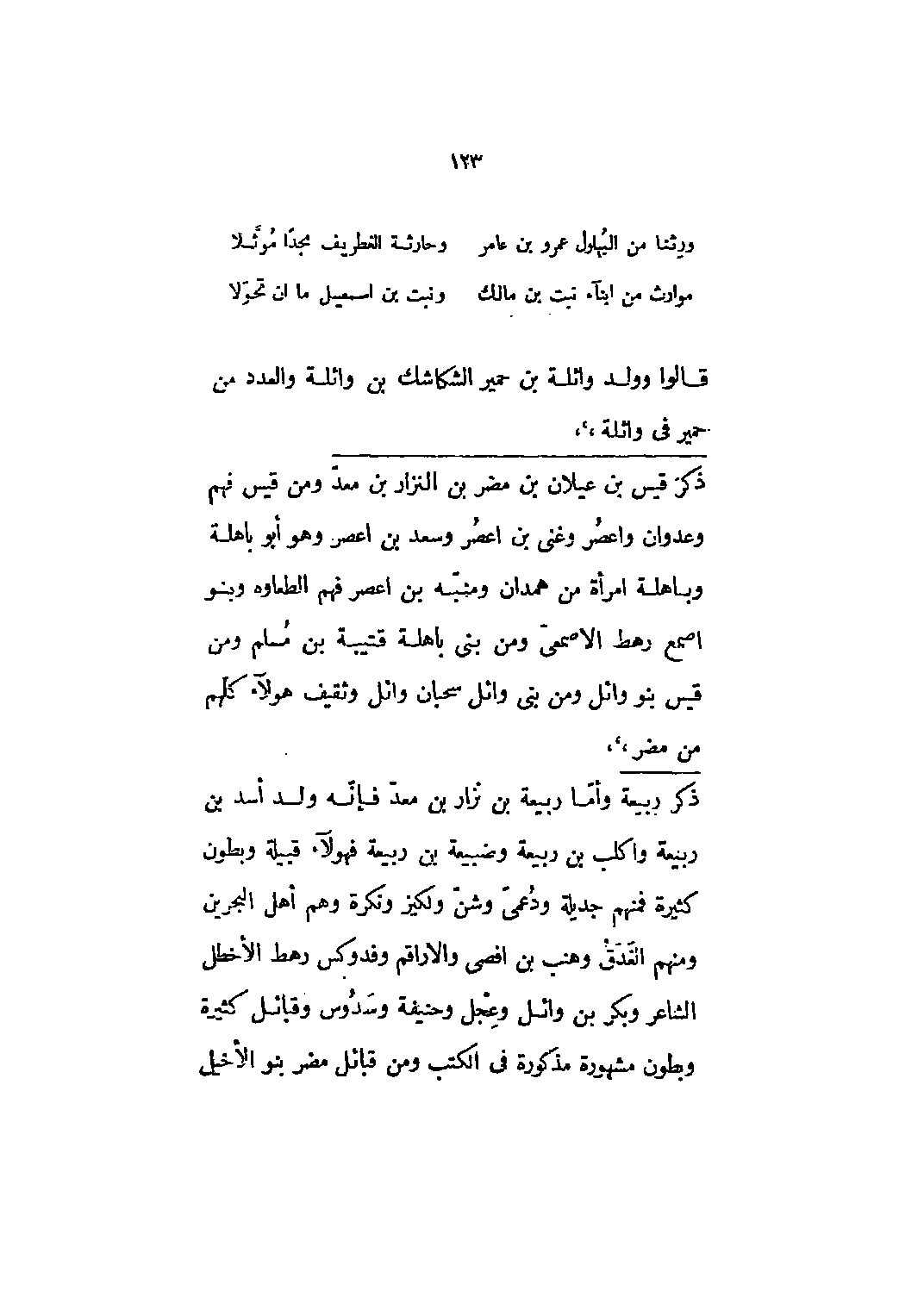 ومن قيس فهم وعدوان واعصر وغني بن اعصر وسعد بن أعصر وهو أبو باهلة وباهلة امرأة من همدان ومنبه بن اعصر فهم الطعاوه وبنو اصمع رهط الأصمعي ومن بني باهلة قتيبة بن مسلم ومن قيس بنو وائل ومن بنى وائل سحبان وائل وثقيف هؤلاء كلهم من مضر،،،
