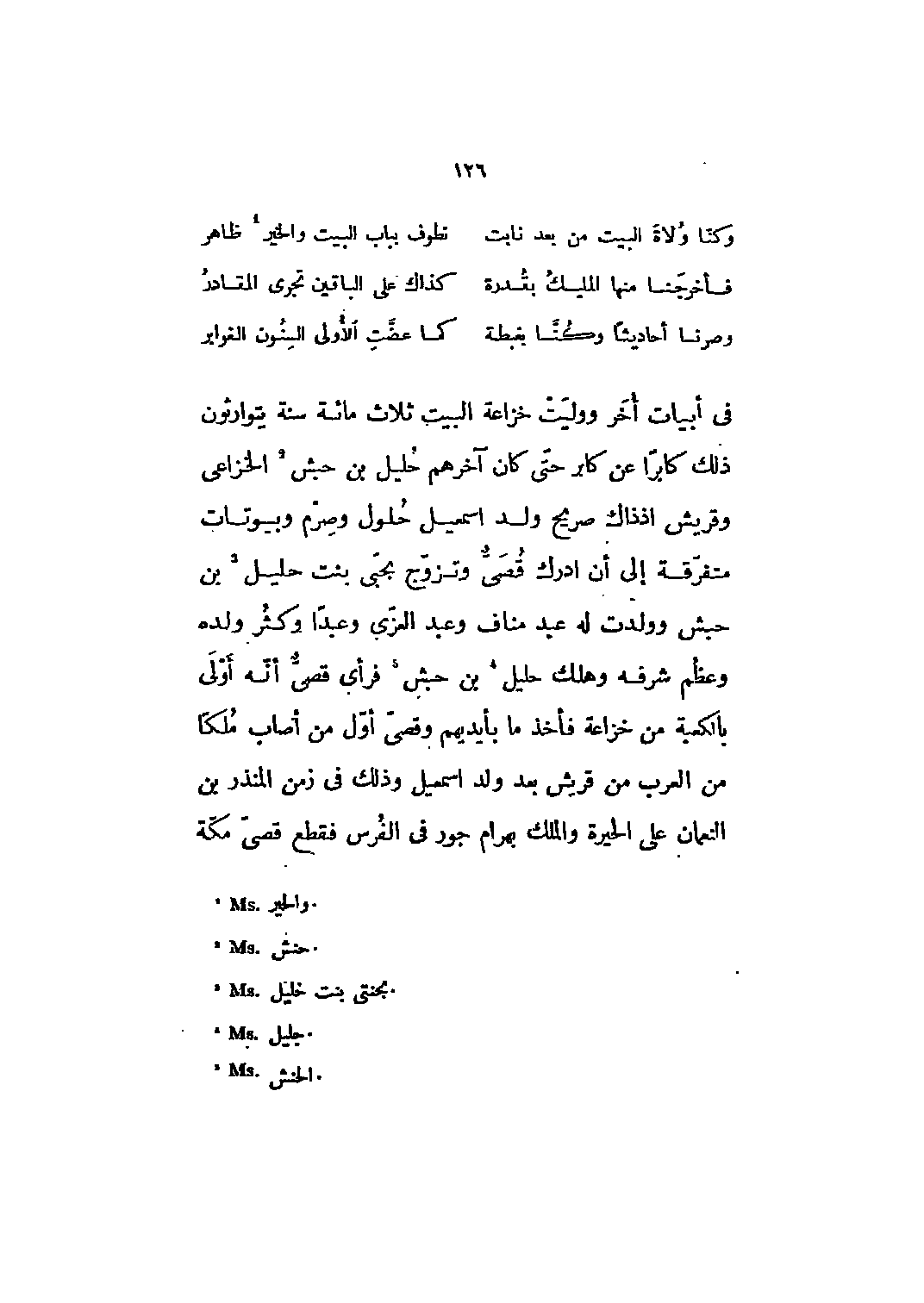 في أبيات أخر ووليت خزاعة البيت ثلاث مائة سنة يتوارثون ذلك كابرا عن كابر حتى كان آخرهم حليل بن حبش [2] الخزاعي وقريش إذ ذاك صريح ولد إسماعيل حلول وصرم وبيوتات متفرقة إلى أن أدرك قصي وتزوج بحبى بنت حليل [3] بن حبش وولدت له عبد مناف وعبد العزي وعبدا وكثر ولده وعظم شرفه وهلك حليل [4] بن حبش [5] فرأى قصي أنه أولى بالكعبة من خزاعة فأخذ ما بأيديهم وقصي أول من أصاب ملكا من العرب من قريش بعد ولد إسماعيل وذلك في زمن المنذر بن النعمان على الحيرة والملك بهرام جور في الفرس فقطع قصىّ مكّة