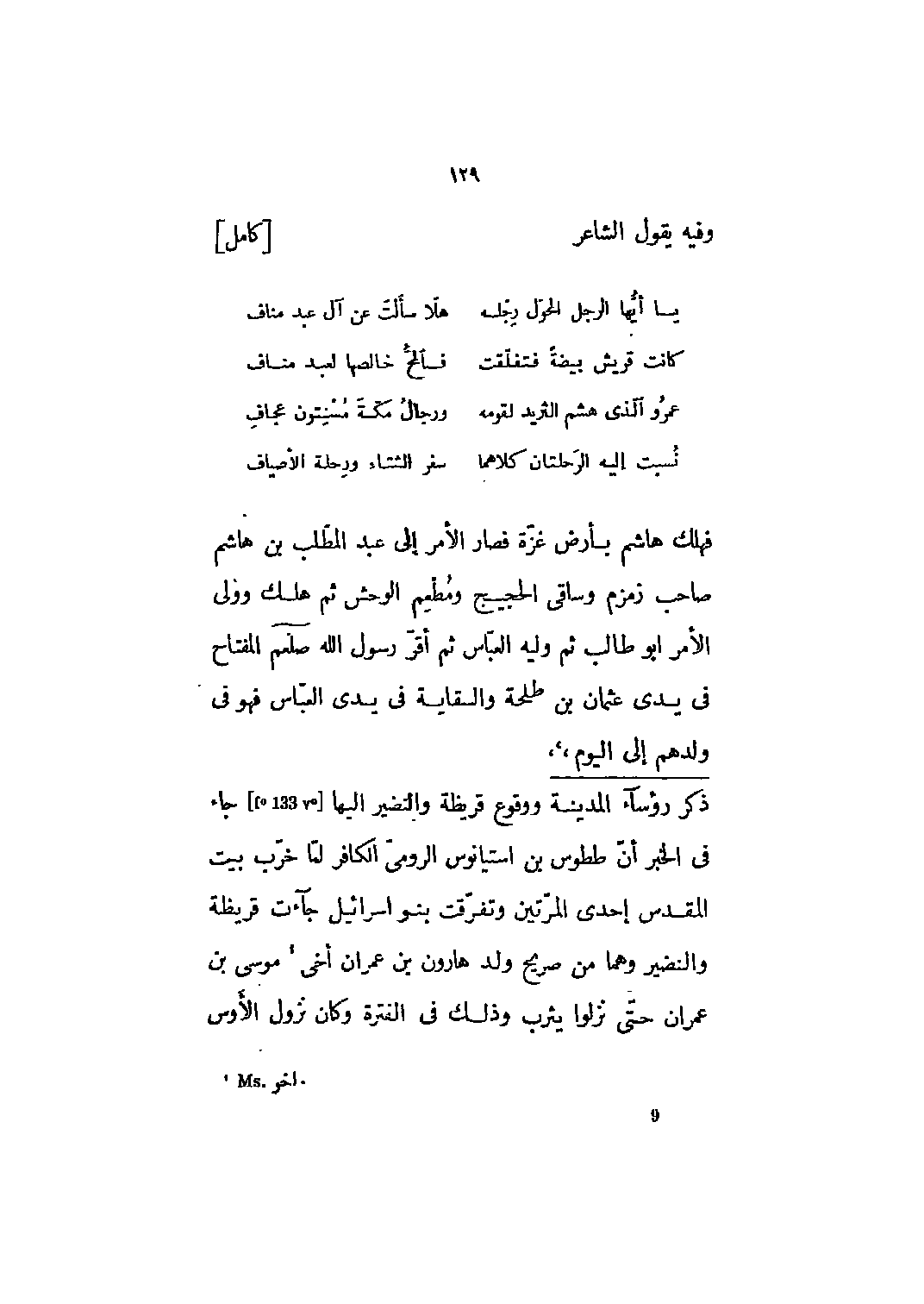 [F؟ 133 v؟] جاء في الخبر أن ططوس بن استيانوس الرومي الكافر لما خرب بيت المقدس إحدى المرتين وتفرقت بنو إسرائيل جاءت قريظة والنضير وهما من صريح ولد هارون بن عمران أخى [1] موسى بن عمران حتى نزلوا يثرب وذلك في الفترة وكان نزول الأوس