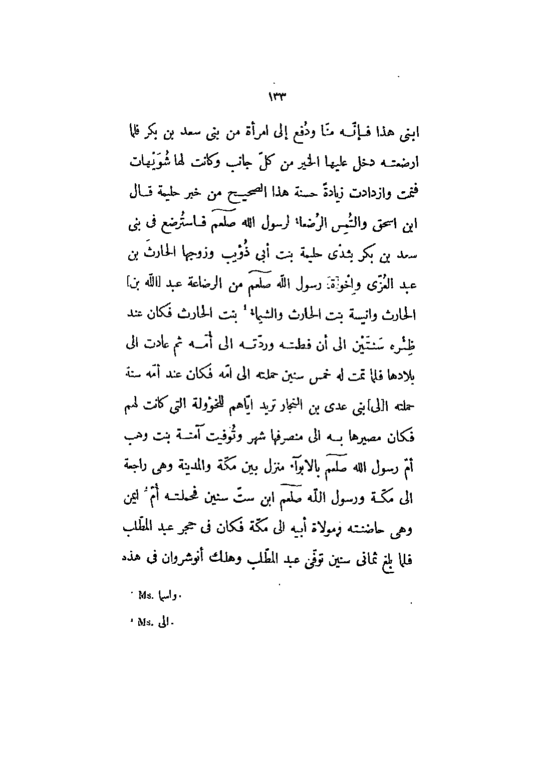 ابني هذا فإنه منا ودفع إلى امرأة من بني سعد بن بكر فلما ارضعته دخل عليها الخير من كل جانب وكانت لها شويهات فنمت وازدادت زيادة حسنة هذا الصحيح من خبر حليمة قال ابن إسحاق والتمس الرضعاء لرسول الله صلى الله عليه وسلم فاسترضع في بني سعد بن بكر بثدي حليمة بنت أبي ذؤيب وزوجها الحارث بن عبد العزّى وأخو [ة] رسول الله صلى الله عليه وسلم من الرضاعة عبد [الله بن] الحارث وانيسة بنت الحارث والشيماء [1] بنت الحارث فكان عند ظئره سنتين إلى أن فطمته وردته إلى أمه ثم عادت إلى بلادها فلما تمت له خمس سنين حملته إلى أمه فكان عند أمّه سنة حملته أ [لي] بنى عدي بن النجار تريد إيّاهم الخؤولة التي كانت لهم فكان مصيرها به إلى منصرفها شهر وتوفيت آمنة بنت وهب أم رسول الله صلى الله عليه وسلم بالأبواء منزل بين مكة والمدينة وهي راجعة الى مكّة ورسول الله صلى الله عليه وسلم ابن ست سنين فحملته أم [2] أيمن وهي حاضنته ومولاة أبيه إلى مكة فكان في حجر عبد المطلب فلما بلغ ثماني سنين توفي عبد المطلب وهلك انوشروان في هذه
