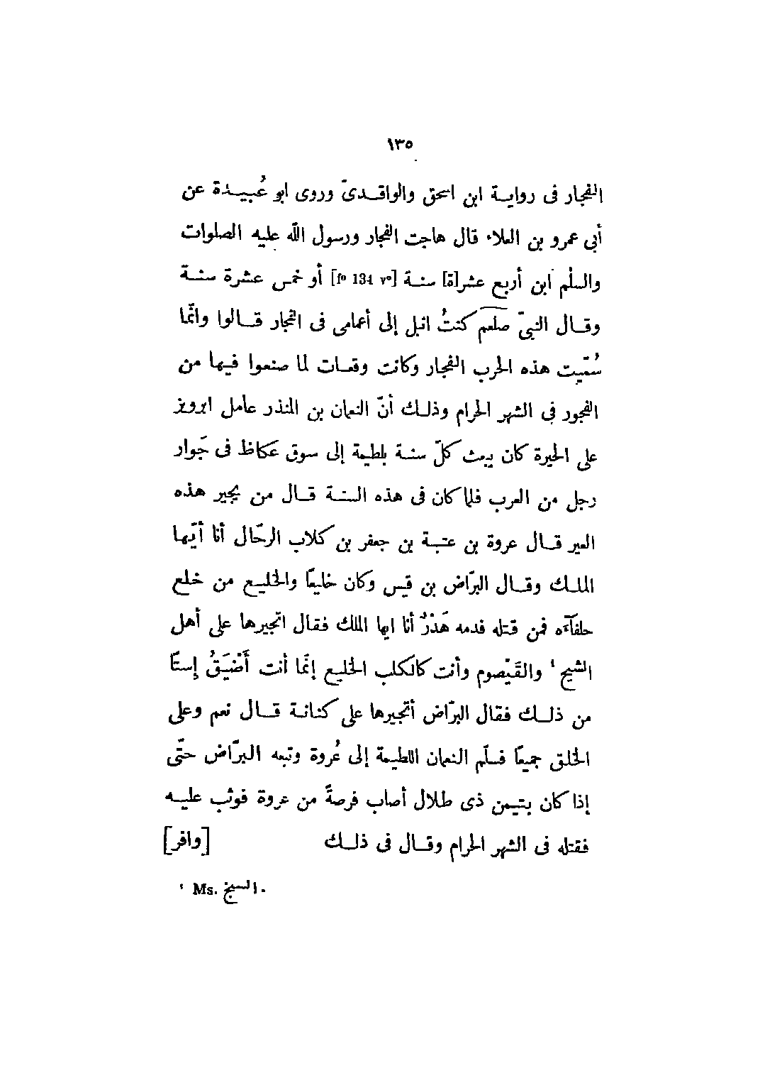 الفجار في رواية ابن إسحاق والواقدي وروى أبو عبيدة عن أبي عمرو بن العلاء قال هاجت الفجار ورسول الله عليه الصلوات والسلم ابن أربع عشر [ة] سنة [F؟ 134 V؟] أو خمس عشرة سنة وقال النبي صلى الله عليه وسلم كنت أنبل إلى أعمامي في الفجار قالوا وإنما سميت هذه الحرب الفجار وكانت وقعات لما صنعوا فيها من الفجور في الشهر الحرام وذلك أن النعمان بن المنذر عامل ابرويز على الحيرة كان يبعث كل سنة بلطيمة إلى سوق عكاظ في جوار رجل من العرب فلما كان في هذه السنة قال من يحير هذه العير قال عروة بن عتبة بن جعفر بن كلاب الرحال أنا أيها الملك وقال البراض بن قيس وكان خليعا والخليع من خلع خلفاءه فمن قتله فدمه هدر أنا أيها الملك فقال أتجيرها على أهل الشيخ [1] والقيصوم وأنت كالكلب الخليع إنما أنت أضيق إستا من ذلك فقال البراض أتجيرها على كنانة قال نعم وعلى الخلق جميعا فسلم النعمان اللطيمة إلى عروة وتبعه البراض حتى إذا كان بتيمن ذى طلال أصاب فرصة من عروة فوثب عليه فقتله في الشهر الحرام وقال في ذلك [وافر]
