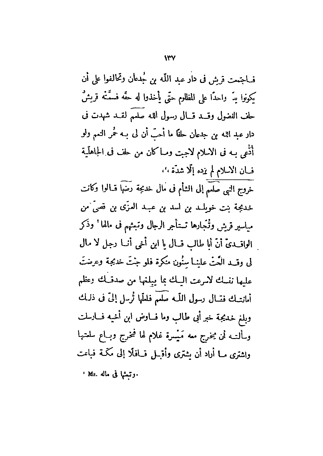 رضي الله عنها قالوا وكانت خديجة بنت خويلد بن اسد بن عبد العزي بن قصي من مياسير قريش وتجارها تستأجر الرجال وتبعثهم في مالها [1] وذكر الواقدي أن أبا طالب قال يا ابن أخي أنا رجل لا مال لي وقد الحت علينا سنون منكرة فلو جئت خديجة وعرضت عليها نفسك لأسرعت إليك بما يبلغها من صدقك وعظم أمانتك فقال رسول الله صلى الله عليه وسلم فلعلها ترسل إلي في ذلك وبلغ خديجة خبر أبي طالب وما فاوض ابن أخيه فارسلت وسألته أن يخرج معه ميسرة غلام لها فخرج وباع سلعتها واشترى ما أراد أن يشتري وأقبل قافلا إلى مكة فباعت