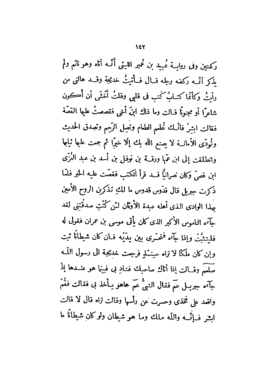 ركعتين وفي رواية عبيد بن عمير الليثي أنه أتاه وهو نائم ولم يذكر أنه ركضه برجله قال فأتيت خديجة وقد هالني من رأيت وكأنما كتاب كتب في قلبي وقلت أخشى أن أكون شاعرا أو مجنونا قالت وما ذاك ابن أخي فقصصت عليها القصة فقالت ابشر فانك تطعم الطعام وتصل الرحم وتصدق الحديث وتؤدي الأمانة لا يصنع الله بك إلا خيرا ثم جمعت عليها ثيابها وانطلقت إلى ابن عمها ورقة بن نوفل بن أسد بن عبد العزي ابن قصي وكان نصرانيا قد قرأ الكتب فقصت عليه الخبر فلما ذكرت جبريل قال قدّوس قدوس ما لك تذكرين الروح الأمين بهذا الوادي الذي أهله عبدة الأوثان لئن كنت صدقتني لقد جاءه الناموس الأكبر الذي كان يأتي موسى بن عمران فقولي له فليتثبت وإذا جاءه فتحسري بين يديه فإن كان شيطانا ثبت وإن كان ملكا لا تراه حينئذ فرجعت خديجة إلى رسول الله صلى الله عليه وسلم وقالت إذا أتاك صاحبك فناد بي فبينما هو عندها إذ جاء جبريل عم فقال النبي عم ها هو يأخذ بي فقالت فقم واقعد على فخذى وحسرت عن رأسها وقالت تراه قال لا قالت ابشر فإنه والله ملك وما هو شيطان ولو كان شيطانا ما