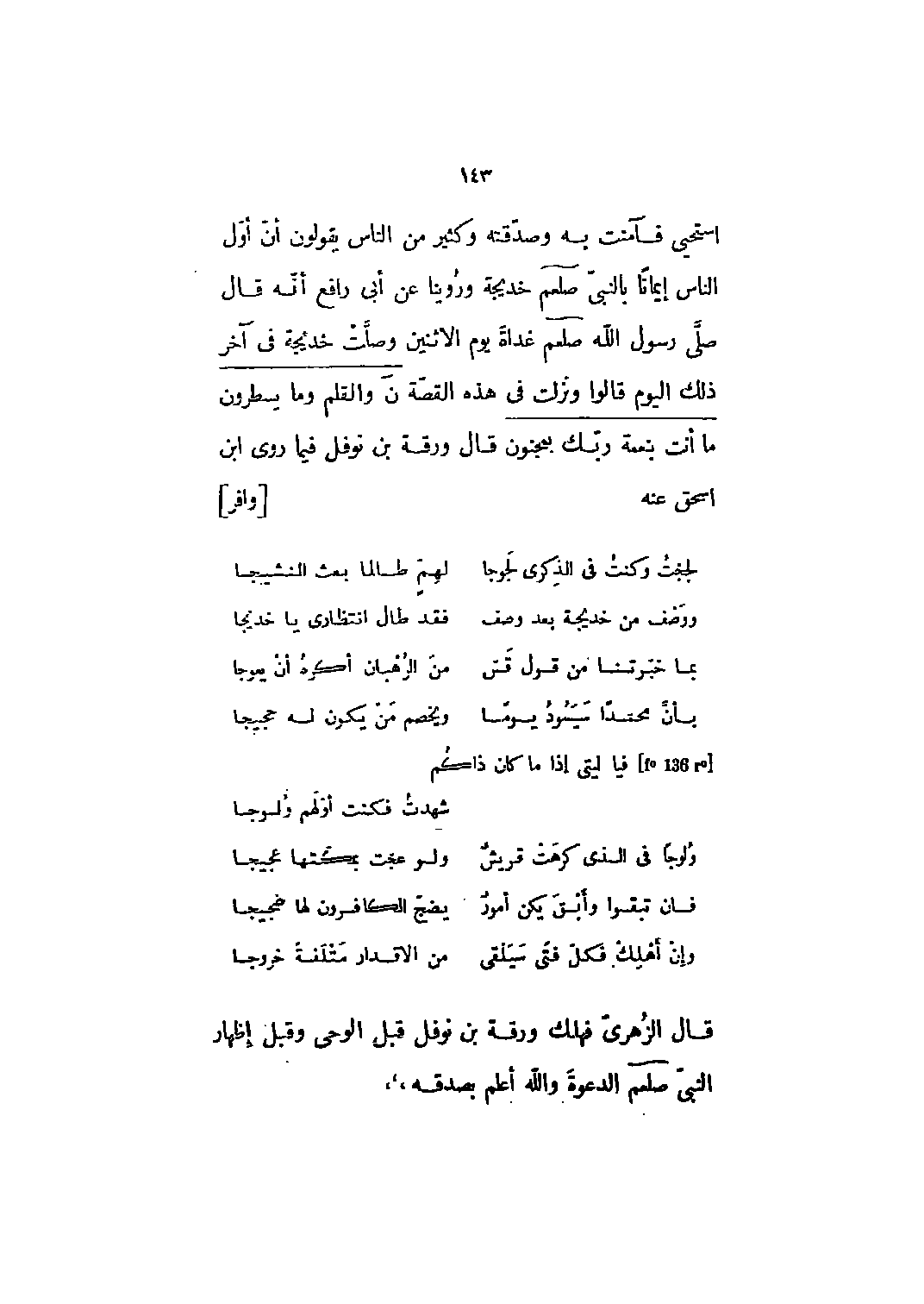 استحيى فآمنت به وصدقته وكثير من الناس يقولون أنّ أوّل الناس إيمانا بالنبيّ صلى الله عليه وسلم خديجة وروينا عن أبي رافع انه قال صلّى رسول الله صلى الله عليه وسلم غداة يوم الاثنين وصلت خديجة في آخر ذلك اليوم قالوا ونزلت في هذه القصة ن وَالْقَلَمِ وَما يَسْطُرُونَ ما أَنْتَ بِنِعْمَةِ رَبِّكَ بِمَجْنُونٍ 68: 1- 2 قال ورقة بن نوفل فيما روى ابن إسحاق عنه [وافر]