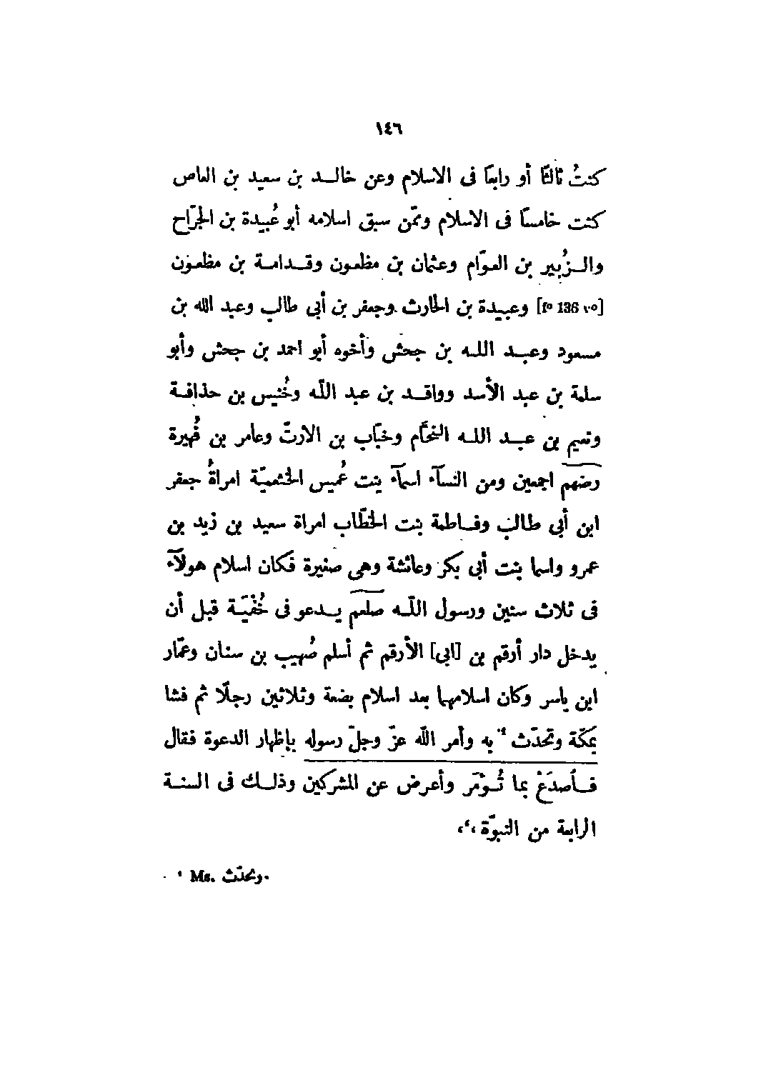 كنت ثالثا أو رابعا في الإسلام وعن خالد بن سعيد بن العاص كنت خامسا في الإسلام وممن سبق إسلامه أبو عبيدة بن الجراح والزبير بن العوام وعثمان بن مظعون وقدامة بن مظعون [F؟ 136 v؟] وعبيدة بن الحارث وجعفر بن أبي طالب وعبد الله بن مسعود وعبد الله بن جحش وأخوه أبو أحمد بن جحش وأبو سلمة بن عبد الأسد وواقد بن عبد الله وخنيس بن حذافة ونعيم بن عبد الله النحام وخباب بن الارتّ وعامر بن فهيرة رضي الله عنهم أجمعين ومن النساء أسماء بنت عميس الخثعمية امرأة جعفر ابن أبي طالب وفاطمة بنت الخطاب امرأة سعيد بن زيد بن عمرو وأسما بنت أبي بكر وعائشة وهي صغيرة فكان إسلام هؤلاء في ثلاث سنين ورسول الله صلى الله عليه وسلم يدعو في خفية قبل أن يدخل دار أرقم بن [أبي] الأرقم ثم أسلم صهيب بن سنان وعمار ابن ياسر وكان إسلامهما بعد إسلام بضعة وثلاثين رجلا ثم فشا بمكة وتحدث [1] به وأمر الله عز وجل رسوله بإظهار الدعوة فقال فَاصْدَعْ بِما تُؤْمَرُ وَأَعْرِضْ عَنِ الْمُشْرِكِينَ 15: 94 وذلك في السنة الرابعة من النبوّة،،،