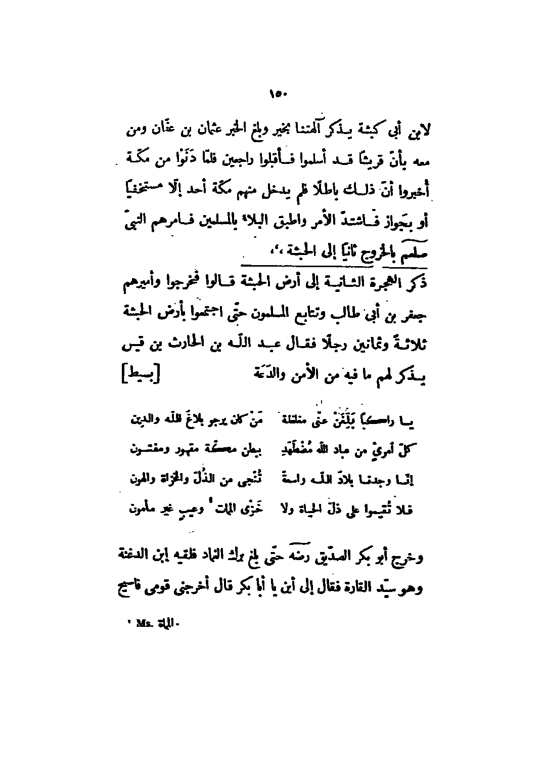 قالوا فخرجوا وأميرهم جعفر بن أبي طالب وتتابع المسلمون حتى اجتمعوا بأرض الحبشة ثلاثة وثمانين رجلا فقال عبد الله بن الحارث بن قيس يذكر لهم ما فيه من الأمن والدعة [بسيط]