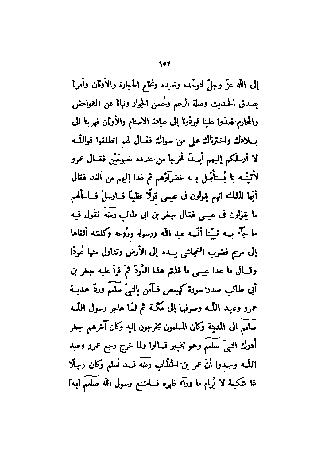 إلى الله عز وجل لنوحده ونعبده ونخلع الحجارة والأوثان وأمرنا بصدق الحديث وصلة الرحم وحسن الجوار ونهانا عن الفواحش والمحارم فعدوا علينا ليردونا إلى عبادة الأصنام والأوثان فهربنا إلى بلادك واخترناك على من سواك فقال لهم انطلقوا فو الله لا أرسلكم إليهم أبدا فخرجا من عنده مقبوحين فقال عمرو لأتينه بما يستأصل به خضرآؤهم ثم غدا إليهم من الغد فقال أيها الملك إنهم يقولون في عيسى قولا عظيما فأرسل فاسألهم ما يقولون في عيسى فقال جعفر بن ابى طالب رضي الله عنه نقول فيه ما جاء به نبينا أنه عبد الله ورسوله وروحه وكلمته ألقاها إلى مريم فضرب النجاشي يده إلى الأرض وتناول منها عودا وقال ما عدا عيسى ما قلتم هذا العود ثم قرأ عليه جعفر بن أبي طالب صدر سورة كهيعص فآمن بالنبيّ صلى الله عليه وسلم ورد هدية عمرو وعبد الله وصرفهما إلى مكّة ثمّ لمّا هاجر رسول الله صلى الله عليه وسلم إلى المدينة وكان المسلمون يخرجون إليه وكان آخرهم جعفر أدرك النبيّ صلى الله عليه وسلم وهو بخيبر قالوا ولما خرج رجع عمرو وعبد الله وجدوا أن عمر بن الخطاب رضي الله عنه قد أسلم وكان رجلا ذا شكيمة لا يرام ما وراء ظهره فامتنع رسول الله صلى الله عليه وسلم [به]