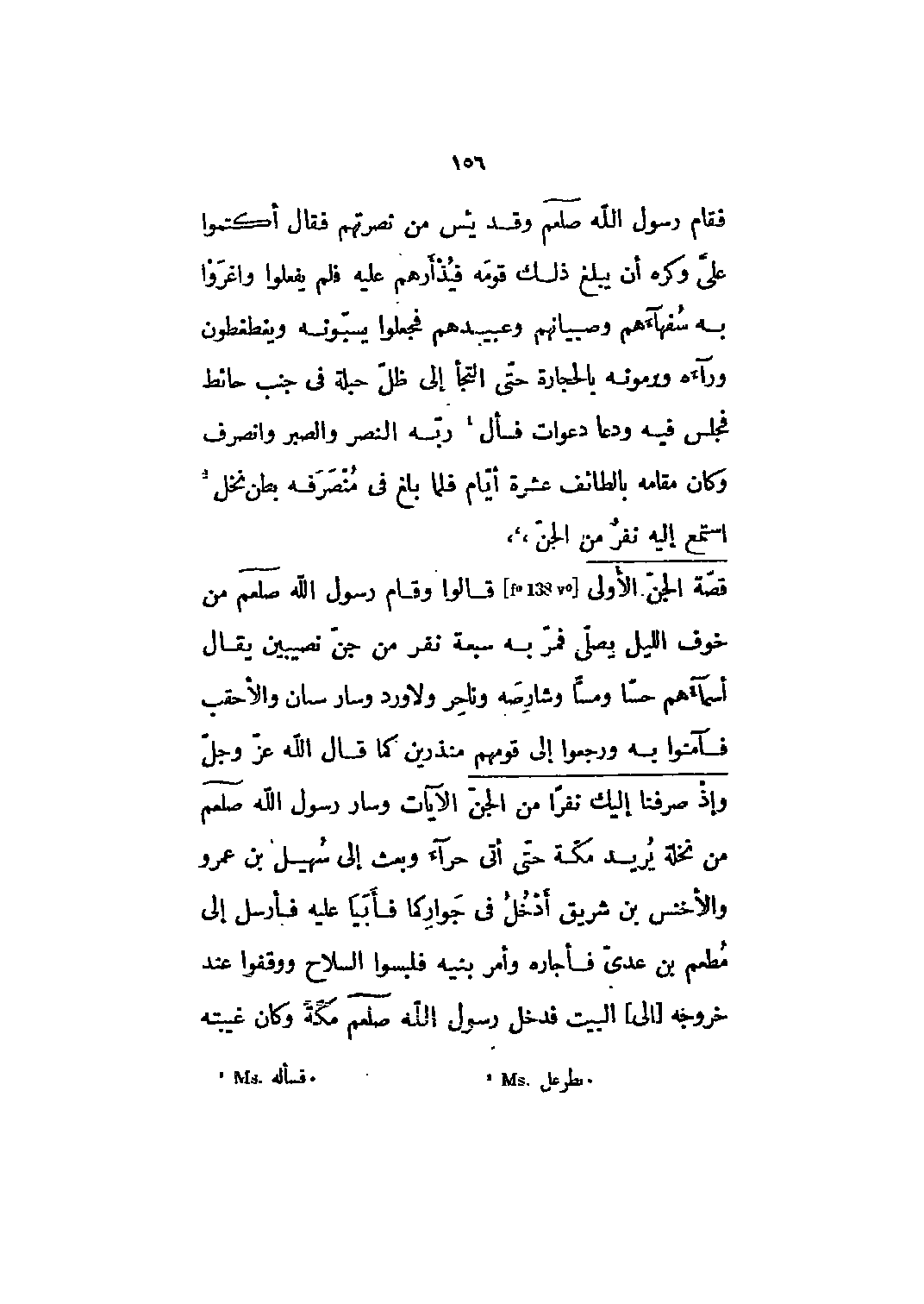 [F؟ 138 v؟] قالوا وقام رسول الله صلى الله عليه وسلم من خوف الليل يصلي فمر به سبعة نفر من جن نصيبين يقال أسماءهم حسا ومسا وشارصه وناحر ولا ورد وسار سان والأحقب فآمنوا به ورجعوا إلى قومهم منذرين كما قال الله عزّ وجلّ وَإِذْ صَرَفْنا إِلَيْكَ نَفَراً من الْجِنِّ 46: 29 الآيات وسار رسول الله صلى الله عليه وسلم من نخلة يريد مكة حتى أتى حراء وبعث إلى سهيل بن عمرو والأخنس بن شريق أدخل في جواركما فأبيا عليه فأرسل إلى مطعم بن عدي فأجاره وأمر بنيه فلبسوا السلاح ووقفوا عند خروجه [إلى] البيت فدخل رسول الله صلى الله عليه وسلم مكّة وكان غيبته