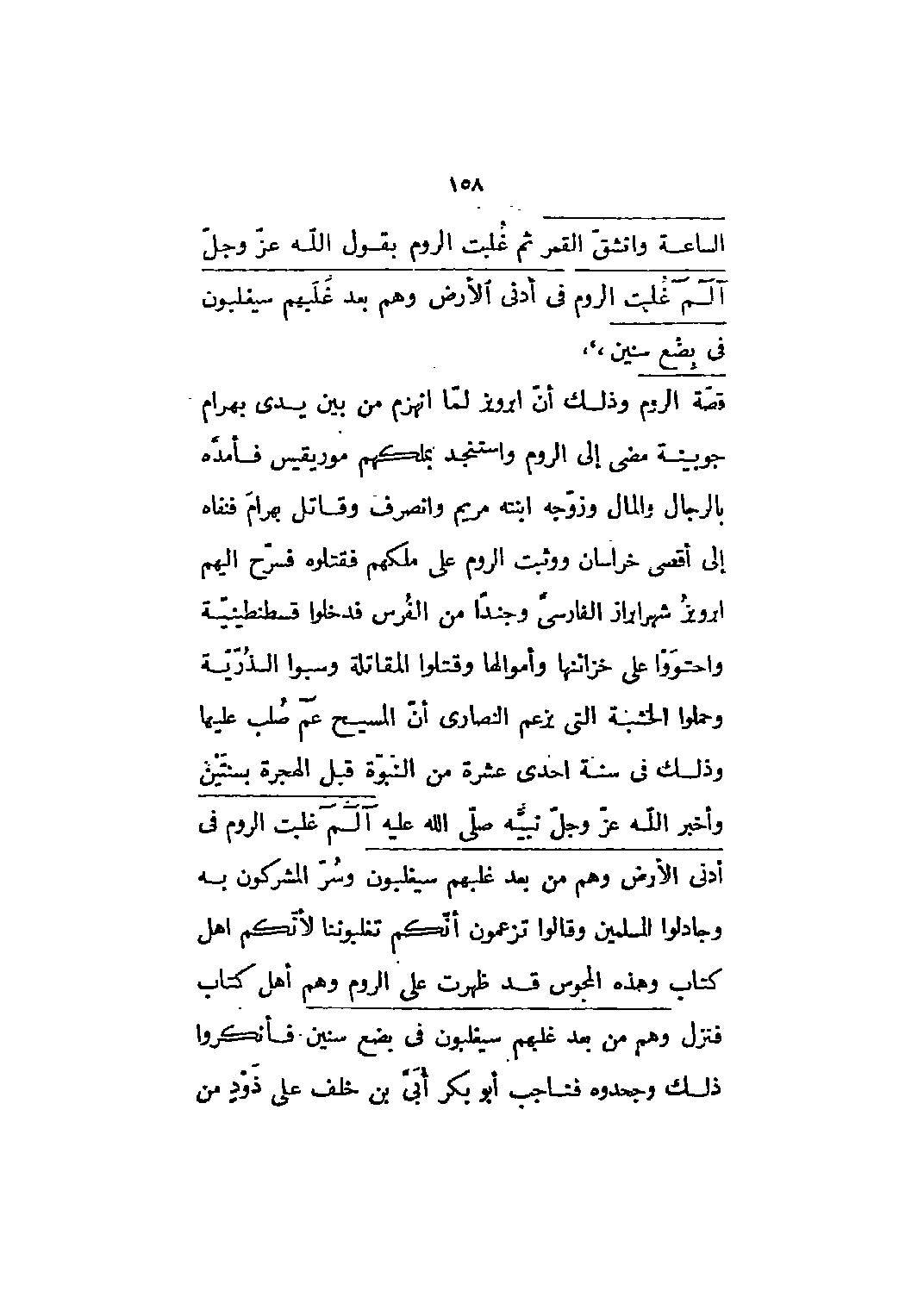 وذلك أن ابرويز لما انهزم من بين يدي بهرام جوبينة مضى إلى الروم واستنجد بملكهم موريقيس فأمده بالرجال والمال وزوجه ابنته مريم وانصرف وقاتل بهرام فنفاه إلى أقصى خراسان ووثبت الروم على ملكهم فقتلوه فسرح إليهم ابرويز شهر ابراز الفارسىّ وجندا من الفرس فدخلوا قسطنطينيّة واحتووا على خزائنها وأموالها وقتلوا المقاتلة وسبوا الذرية وحملوا الخشبة التي يزعم النصارى أن المسيح عم صلب عليها وذلك في سنة احدى عشرة من النبوة قبل الهجرة بسنتين وأخبر الله عز وجل نبيه صلى الله عليه آلم غُلِبَتِ الرُّومُ في أَدْنَى الْأَرْضِ وَهُمْ من بَعْدِ غَلَبِهِمْ سَيَغْلِبُونَ 30: 1- 3 وسرّ المشركون به وجادلوا المسلمين وقالوا تزعمون أنكم تغلبوننا لأنكم أهل كتاب وهذه المجوس قد ظهرت على الروم وهم أهل كتاب فنزل وَهُمْ من بَعْدِ غَلَبِهِمْ سَيَغْلِبُونَ في بِضْعِ سِنِينَ 30: 3- 4 فأنكروا ذلك وجحدوه فناجب أبو بكر أبي بن خلف على ذود من