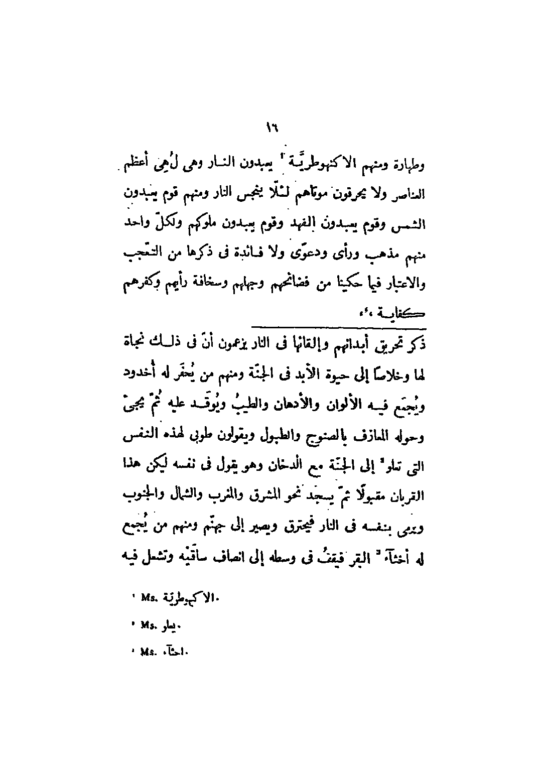 وطهارة ومنهم الاكتهوطريّة [1] يعبدون النار وهي ل هي أعظم العناصر ولا يحرقون موتاهم لئلا ينجس النار ومنهم قوم يعبدون الشمس وقوم يعبدون الفهد وقوم يعبدون ملوكهم ولكل واحد منهم مذهب ورأي ودعوى ولا فائدة في ذكرها من التعجب والاعتبار فيما حكينا من فضائحهم وجهلهم وسخافة رأيهم وكفرهم كفاية،،،