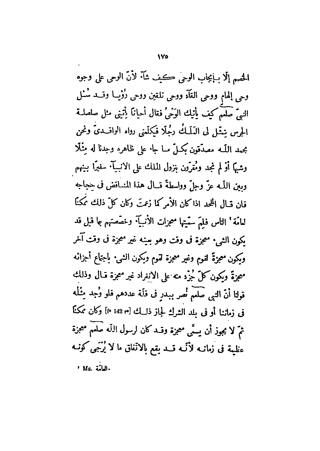 الخصم إلا بإيجاب الوحي كيف شاء لأن الوحي على وجوه وحي إلهام ووحي إلقاء ووحي نلقين ووحي رؤيا وقد سئل النبيّ صلى الله عليه وسلم كيف يأتيك الوحي فقال أحيانا يأتيني مثل صلصلة الجرس يتمثل لي الملك رجلا فيكلمني رواه الواقدي ونحن بحمد الله مصدقون بكل ما جاء على ظاهره وجدنا له مثلا وشبها أو لم نجد ومقرون بنزول الملك على الأنبياء سفيرا بينهم وبين الله عز وجل وواسطة قال هذا المناقض في حجاجه فان قال الملحد إذا كان الأمر كما زعمت وكان كل ذلك ممكنا لعامة [1] الناس فلم سميتها معجزات الأنبياء وخصصتهم بها قيل قد يكون الشيء معجزة في وقت وهو بعينه غير معجزة في وقت آخر ويكون معجزة لقوم وغير معجزة لقوم ويكون الشيء باجتماع أجزائه معجزة ويكون كل جزء منه على الانفراد غير معجزة قال وذلك قولنا أنّ النبي صلى الله عليه وسلم نصر ببدر في قلة عددهم فلو وجد مثله في زماننا أو في بلد الشرك لجاز ذلك [F؟ 142 r؟] وكان ممكنا ثم لا يجوز أن يسمى معجزة وقد كان لرسول الله صلى الله عليه وسلم معجزة عظيمة في زمانه لأنه قد يقع بالاتّفاق ما لا يرجى كونه