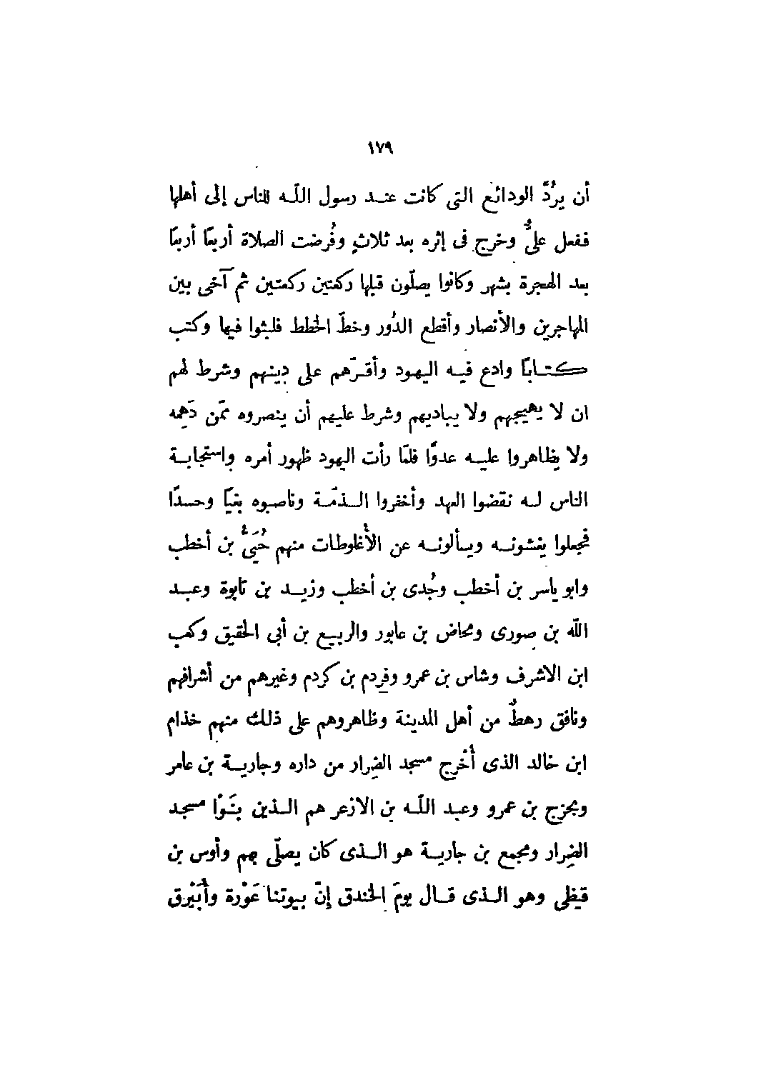 أن يرد الودائع التي كانت عند رسول الله للناس إلى أهلها ففعل علي وخرج في إثره بعد ثلاث وفرضت الصلاة أربعا أربعا بعد الهجرة بشهر وكانوا يصلون قبلها ركعتين ركعتين ثم آخى بين المهاجرين والأنصار وأقطع الدور وخط الخطط فلبثوا فيها وكتب كتابا وادع فيه اليهود وأقرهم على دينهم وشرط لهم أن لا يهيجهم ولا يباديهم وشرط عليهم أن ينصروه ممن دهمه ولا يظاهروا عليه عدوا فلما رأت اليهود ظهور أمره واستجابة الناس له نقضوا العهد وأخفروا الذمة وناصبوه بغيا وحسدا فجعلوا يغشونه ويسألونه عن الأغلوطات منهم حيىّ بن أخطب وأبو ياسر بن أخطب وجدي بن أخطب وزيد بن تابوة وعبد الله بن صورى ومحاض بن عابور والربيع بن أبى الحقيق وكعب ابن الاشرف وشاس بن عمرو وفردم بن كردم وغيرهم من أشرافهم ونافق رهط من أهل المدينة وظاهروهم على ذلك منهم خذام ابن خالد الذي أخرج مسجد الضرار من داره وجارية بن عامر وبحزج بن عمرو وعبد الله بن الأزعر هم الذين بنوا مسجد الضرار ومجمع بن جارية هو الذي كان يصلي بهم وأوس بن قيظي وهو الّذي قال يوم الخندق إن بيوتنا عورة وأبيرق
