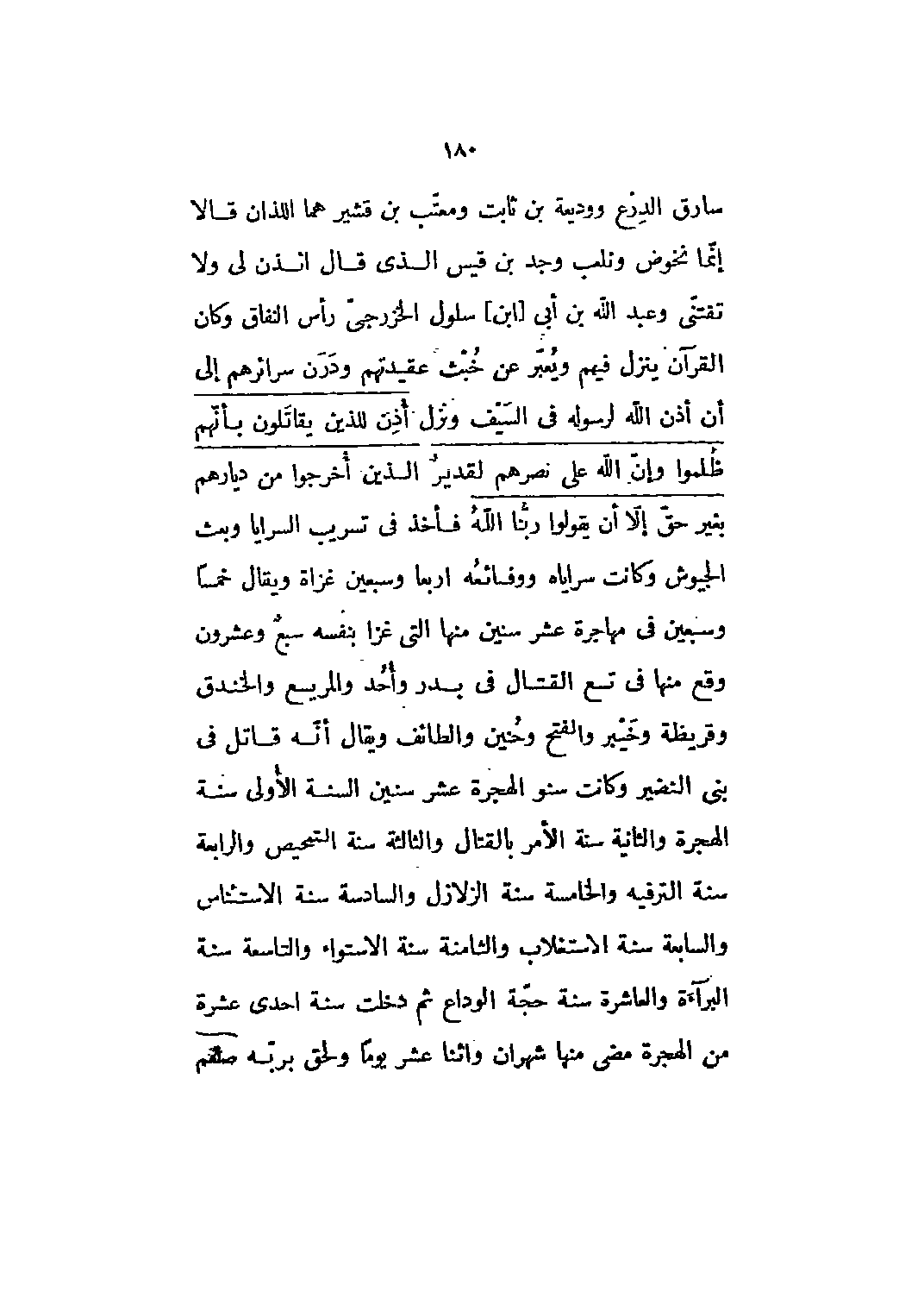 سارق الدرع ووديعة بن ثابت ومعتّب بن قشير هما اللذان قالا إنما نخوض ونلعب وجد بن قيس الذي قال ائذن لي ولا تفتني وعبد الله بن أبي [ابن] سلول الخزرجي رأس النفاق وكان القرآن ينزل فيهم ويعبر عن خبث عقيدتهم ودرن سرائرهم إلى أن أذن الله لرسوله في السيف ونزل أُذِنَ لِلَّذِينَ يُقاتَلُونَ بِأَنَّهُمْ ظُلِمُوا وَإِنَّ الله عَلى نَصْرِهِمْ لَقَدِيرٌ الَّذِينَ أُخْرِجُوا من دِيارِهِمْ بِغَيْرِ حَقٍّ إِلَّا أَنْ يَقُولُوا رَبُّنَا الله 22: 39- 40 فاخذ في تسريب السرايا وبعث الجيوش وكانت سراياه ووقائعه أربعا وسبعين غزاة ويقال خمسا وسبعين في مهاجرة عشر سنين منها التي غزا بنفسه سبع وعشرون وقع منها في تسع القتال في بدر وأحد والمريسيع والخندق وقريظة وخيبر والفتح وحنين والطائف ويقال أنه قاتل في بني النضير وكانت سنو الهجرة عشر سنين السنة الأولى سنة الهجرة والثانية سنة الأمر بالقتال والثالثة سنة التمحيص والرابعة سنة الترفيه والخامسة سنة الزلازل والسادسة سنة الاستئناس والسابعة سنة الاستغلاب والثامنة سنة الاستواء والتاسعة سنة البراءة والعاشرة سنة حجة الوداع ثم دخلت سنة إحدى عشرة من الهجرة مضى منها شهران واثنا عشر يوما ولحق بربه صلى الله عليه وسلم