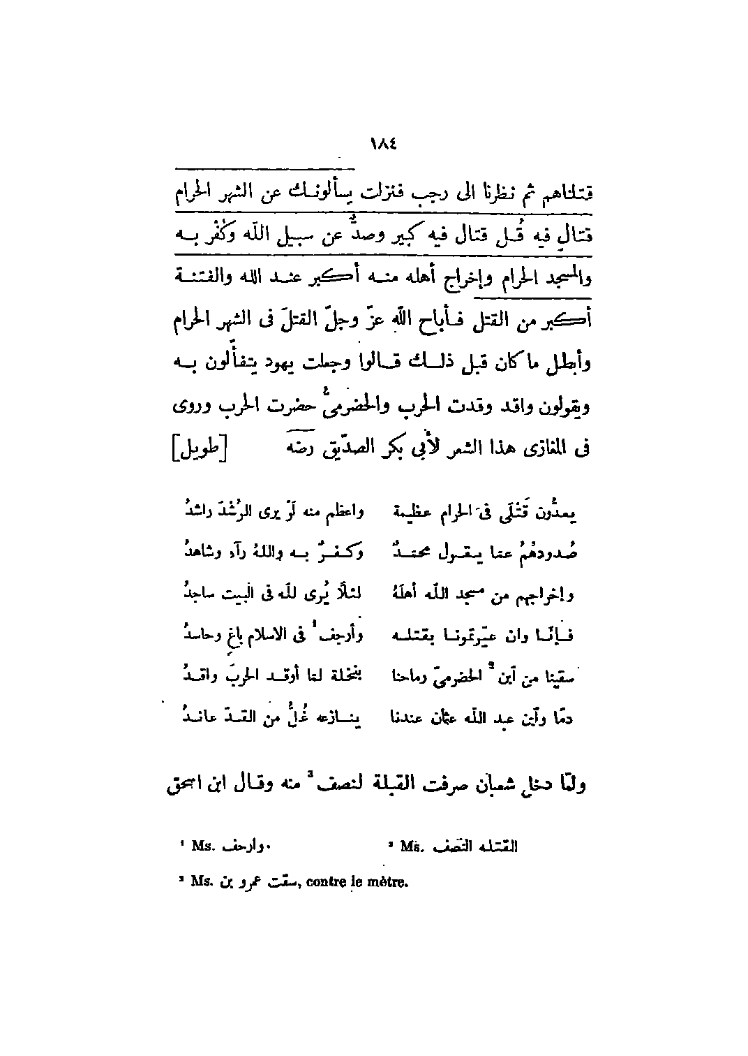 قتلناهم ثم نظرنا الى رجب فنزلت يَسْئَلُونَكَ عَنِ الشَّهْرِ الْحَرامِ قِتالٍ فِيهِ قُلْ قِتالٌ فِيهِ كَبِيرٌ وَصَدٌّ عَنْ سَبِيلِ الله وَكُفْرٌ به وَالْمَسْجِدِ الْحَرامِ وَإِخْراجُ أَهْلِهِ مِنْهُ أَكْبَرُ عِنْدَ الله وَالْفِتْنَةُ أَكْبَرُ من الْقَتْلِ 2: 217 فأباح الله عز وجل القتل في الشهر الحرام وأبطل ما كان قبل ذلك قالوا وجعلت يهود يتفألون به ويقولون واقد وقدت الحرب والحضرمي حضرت الحرب وروى في المغازى هذا الشعر لأبى بكر الصدّيق رضي الله عنه [طويل]