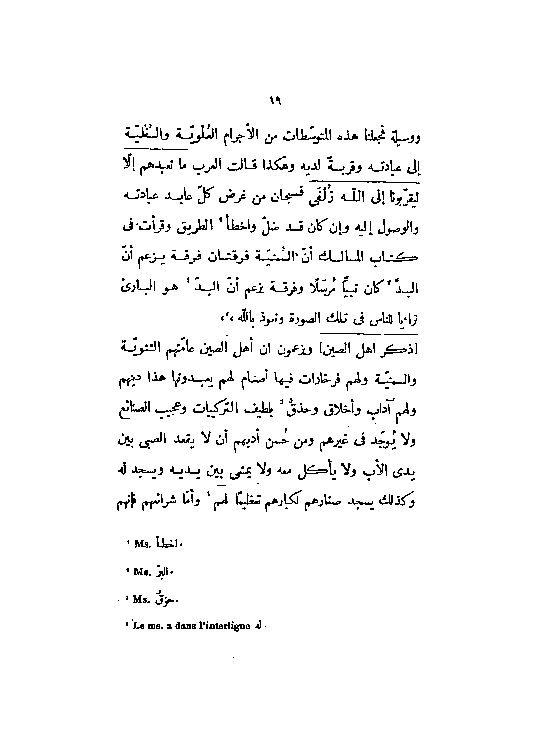 ووسيلة فجعلنا هذه المتوسطات من الأجرام العلوية والسفلية إلى عبادته وقربة لديه وهكذا قالت العرب ما نَعْبُدُهُمْ إِلَّا لِيُقَرِّبُونا إِلَى الله زُلْفى 39: 3 فسبحان من غرض كل عابد عبادته والوصول إليه وإن كان قد ضل وأخطأ [1] الطريق وقرأت في كتاب المسالك أن السمنية فرقتان فرقة يزعم أن البد [2] كان نبيا مرسلا وفرقة يزعم أن البد [2] هو البارئ تراءيا للناس في تلك الصورة ونعوذ باللَّه،،،