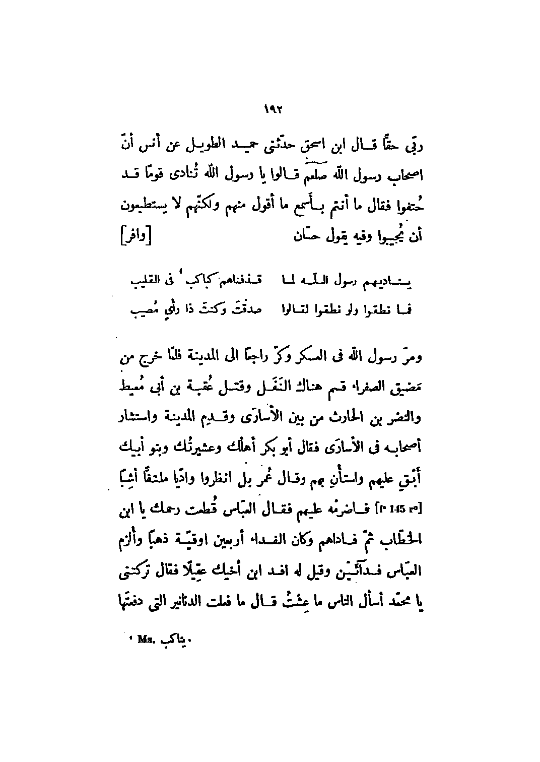 ومر رسول الله في العسكر وكرّ راجعا الى المدينة فلمّا خرج من مضيق الصفراء قسم هناك النفل وقتل عقبة بن أبي معيط والنضر بن الحارث من بين الأسارى وقدم المدينة واستشار أصحابه في الأسارى فقال أبو بكر أهلك وعشيرتك وبنو أبيك ابق عليهم واستأن بهم وقال عمر بل انظروا واديا ملتفا أشبا [F؟ 145 rO] فاضرمه عليهم فقال العباس قطعت رحمك يا ابن الخطاب ثم فاداهم وكان الفداء أربعين اوقية ذهبا وألزم العبّاس فداءين وقيل له افد ابن أخيك عقيلا فقال تركتني يا محمد أسأل الناس ما عشت قال ما فعلت الدنانير التي دفعتها