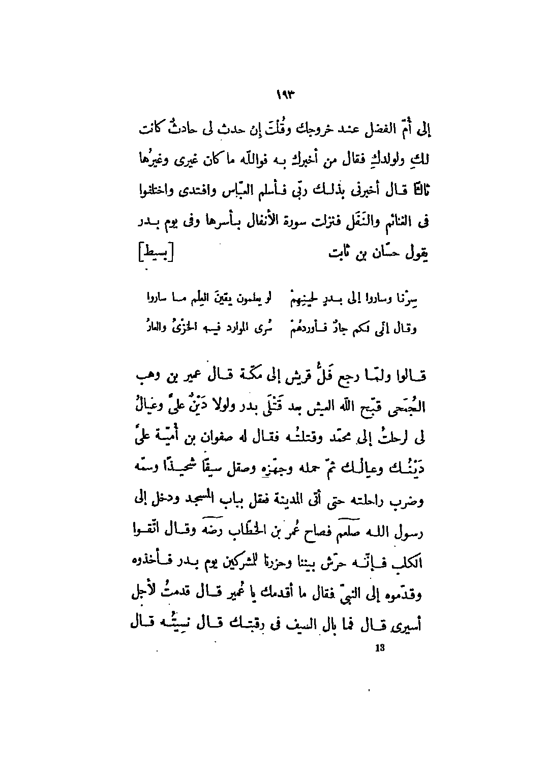 إلى أم الفضل عند خروجك وقلت إن حدث لي حادث كانت لك ولولدك فقال من أخبرك به فو الله ما كان غيري وغيرها ثالثا قال أخبرني بذلك ربي فأسلم العباس وافتدى واختلفوا في الغنائم والنفل فنزلت سورة الأنفال بأسرها وفي يوم بدر يقول حسان بن ثابت [بسيط]