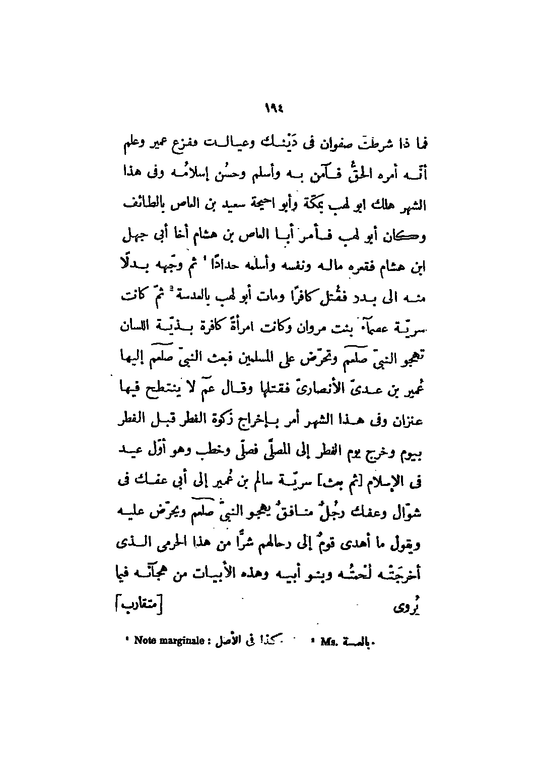 فماذا شرطت صفوان في دينك وعيالك ففزع عمير وعلم أنّه أمره الحق فآمن به وأسلم وحسن إسلامه وفي هذا الشهر هلك أبو لهب بمكة وأبو احيحة سعيد بن العاص بالطائف وكان أبو لهب فأمر أبا العاص بن هشام أخا أبي جهل ابن هشام فقعره ماله ونفسه وأسلمه حدادا [1] ثم وجهه بدلا منه إلى بدر فقتل كافرا ومات أبو لهب بالعدسة [2] ثم كانت سرية عصماء بنت مروان وكانت امرأة كافرة بذيّة اللسان تهجو النبيّ صلى الله عليه وسلم وتحرّض على المسلمين فبعث النبيّ صلى الله عليه وسلم إليها عمير بن عدي الأنصاري فقتلها وقال عم لا ينتطح فيها عنزان وفي هذا الشهر أمر بإخراج زكاة الفطر قبل الفطر بيوم وخرج يوم الفطر إلى المصلى فصلى وخطب وهو أول عيد في الإسلام [ثم بعث] سرية سالم بن عمير إلى أبي عفك في شوال وعفك رجل منافق يهجو النبيّ صلى الله عليه وسلم ويحرّض عليه ويقول ما أهدى قوم إلى رحالهم شرّا من هذا الحرمى الذي أخرجته لحمته وبنو أبيه وهذه الأبيات من هجائه فيما يروى [متقارب]