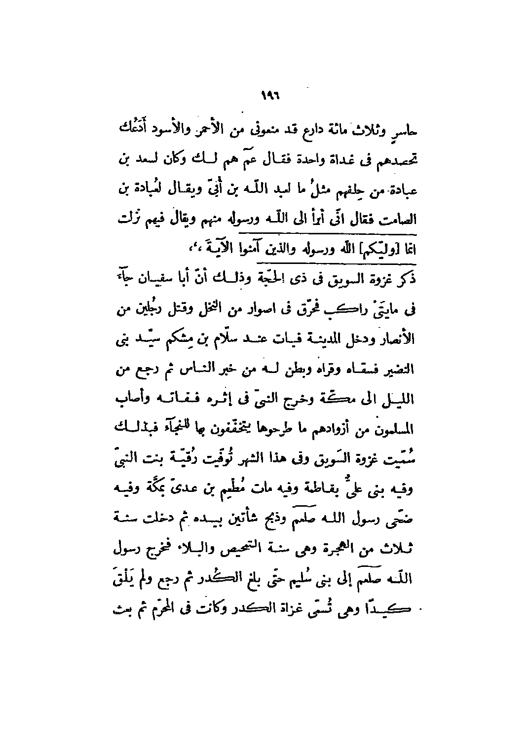 وذلك أنّ أبا سفيان جاء في مائتي راكب فحرق في اصوار من النخل وقتل رجلين من الأنصار ودخل المدينة فبات عند سلام بن مشكم سيد بني النضير فسقاه وقراه وبطن له من خبر الناس ثم رجع من الليل إلى مكة وخرج النبي في إثره ففاته وأصاب المسلمون من أزوادهم ما طرحوها يتخففون بها للنجاء فبذلك سميت غزوة السويق وفي هذا الشهر توفيت رقية بنت النبي وفيه بنى علي بفاطمة وفيه مات مطعم بن عدي بمكة وفيه ضحى رسول الله صلى الله عليه وسلم وذبح شاتين بيده ثم دخلت سنة ثلاث من الهجرة وهي سنة التمحيص والبلاء فخرج رسول الله صلى الله عليه وسلم إلى بني سليم حتى بلغ الكدر ثم رجع ولم يلق كيدا وهي تسمى غزاة الكدر وكانت في المحرم ثم بعث
