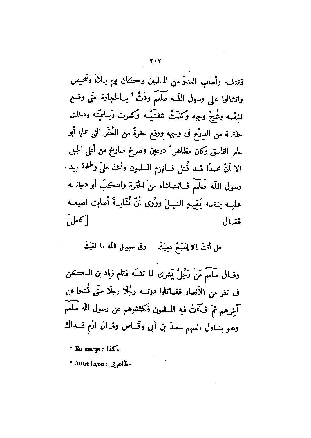 فقتله وأصاب العدو من المسلمين وكان يوم بلاء وتمحيص وانثالوا على رسول الله صلى الله عليه وسلم ودث [1] بالحجارة حتى وقع لشقه وشج وجهه وكلمت شفتيه وكسرت رباعيته ودخلت حلقة من الدرع في وجهه ووقع حفرة من الحفر التي عملها أبو عامر الفاسق وكان مظاهر [2] درعين وصرخ صارخ من أعلى الجبل الا أنّ محمدا قد قتل فانهزم المسلمون وأخذ علي وطلحة بيد رسول الله صلى الله عليه وسلم فانتاشاه من الحفرة وأكب أبو دجانة عليه بنفسه يقيه النبل وروى أنّ نشّابة أصابت إصبعه فقال [كامل]