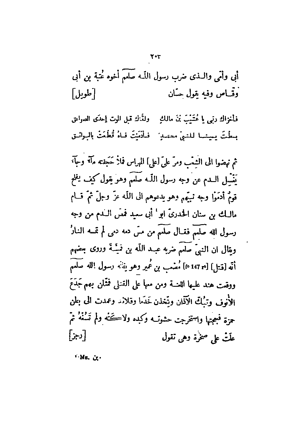 ثم نهضوا الى الشعب ومر على [علي] المهراس فملأ حجفته ماء وجاء يغسل الدم عن وجه رسول الله صلى الله عليه وسلم وهو يقول كيف يفلح قوم أدموا وجه نبيهم وهو يدعوهم إلى الله عز وجل ثم قام مالك بن سنان الخدري أبو [1] أبي سعيد فمص الدم من وجه رسول الله صلى الله عليه وسلم فقال صلى الله عليه وسلم من مس دمه دمى لم تمسه النار ويقال ان النبيّ صلى الله عليه وسلم ضربه عبد الله بن قميئة وروى بعضهم أنه [قتل [F 147 r؟] [مصعب بن عمير وهو يظنه رسول الله صلى الله عليه وسلم ووقعت هند عليها اللعنة ومن معها على القتلى فمثلن بهم جدع الأنوف وتبك الآذان ويتّخذن خدما وقلائد وعمدت إلى بطن حمزة فبعجتها واستخرجت حشوته وكبده ولاكته ولم تسغه ثم علت على صخرة وهي تقول [رجز]