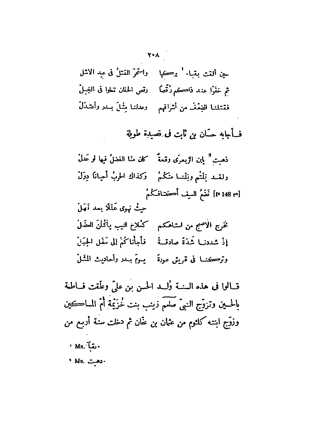 فأجابه حسان بن ثابت في قصيدة طويلة