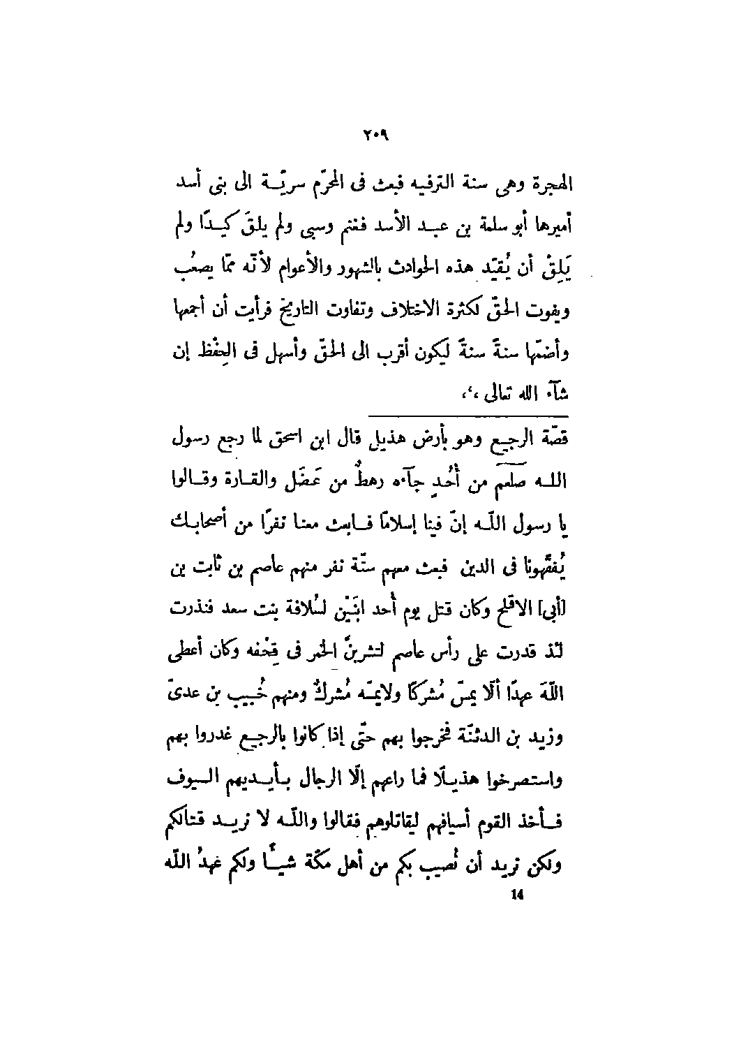 الهجرة وهي سنة الترفيه فبعث في المحرم سرية إلى بني أسد أميرها أبو سلمة بن عبد الأسد فغنم وسبى ولم يلق كيدا ولم يلق أن يقيد هذه الحوادث بالشهور والأعوام لأنه مما يصعب ويفوت الحق لكثرة الاختلاف وتفاوت التاريخ فرأيت أن أجمعها وأضمها سنة سنة ليكون اقرب إلى الحق وأسهل في الحفظ إن شاء الله تعالى،،،