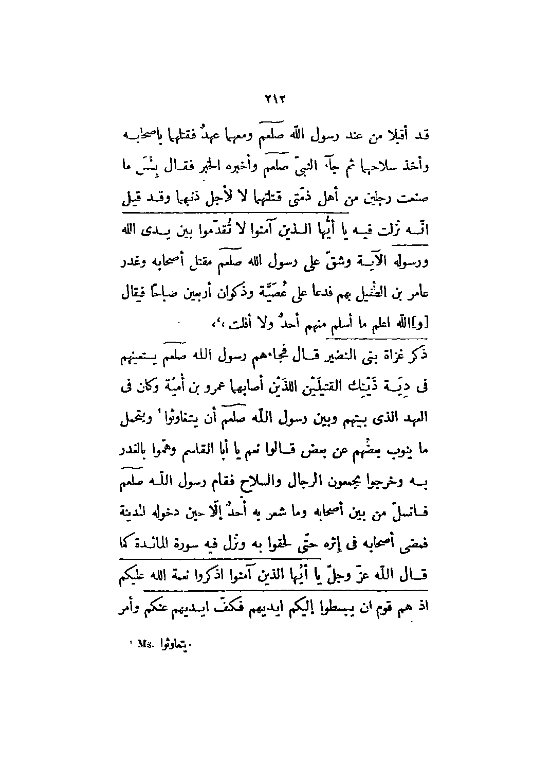 قال فجاءهم رسول الله صلى الله عليه وسلم يستعينهم في دية ذينك القتيلين اللذين أصابهما عمرو بن أمية وكان في العهد الذي بينهم وبين رسول الله صلى الله عليه وسلم أن يتغاوثوا [1] ويتحمل ما ينوب بعضهم عن بعض قالوا نعم يا أبا القاسم وهموا بالغدر به وخرجوا يجمعون الرجال والسلاح فقام رسول الله صلى الله عليه وسلم فانسل من بين أصحابه وما شعر به أحد إلا حين دخوله المدينة فمضى أصحابه في إثره حتى لحقوا به ونزل فيه سورة المائدة كما قال الله عز وجل يا أَيُّهَا الَّذِينَ آمَنُوا اذْكُرُوا نِعْمَتَ الله عَلَيْكُمْ إِذْ هَمَّ قَوْمٌ أَنْ يَبْسُطُوا إِلَيْكُمْ أَيْدِيَهُمْ فَكَفَّ أَيْدِيَهُمْ عَنْكُمْ 5: 11 وأمر