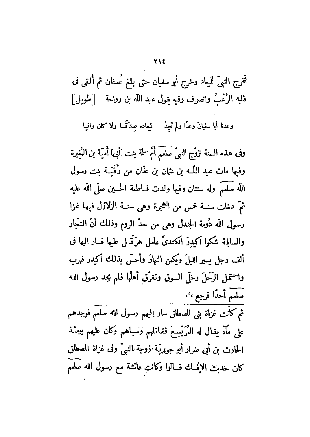 وفي هذه السنة تزوّج النبيّ صلى الله عليه وسلم أم سلمة بنت [أبي] أمية بن المغيرة وفيها مات عبد الله بن عثمان بن عفّان من رقية بنت رسول الله صلى الله عليه وسلم وله سنتان وفيها ولدت فاطمة الحسين صلى الله عليه ثم دخلت سنة خمس من الهجرة وهي سنة الزلازل فيها غزا رسول الله دومة الجندل وهي من حد الروم وذلك أن التجار والسابلة شكوا اكيدر الكندي عامل هرقل عليها فسار إليها في ألف رجل يسير الليل ويكمن النهار وأحس بذلك اكيدر فهرب واحتمل الرحل وخلى السوق وتفرق أهلها فلم يجد رسول الله صلى الله عليه وسلم أحدا فرجع،،،