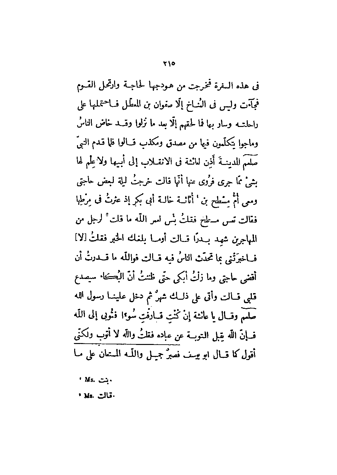 في هذه السفرة فخرجت من هودجها لحاجة وارتحل القوم فجاءت وليس في المناخ إلا صفوان بن المعطل فاحتملها على راحلته وسار بها فما لحقهم إلّا بعد ما نزلوا وقد خاض الناس وماجوا يتكلمون فيها من مصدق ومكذب قالوا فلما قدم النبي صلى الله عليه وسلم المدينة أذن لعائشة في الانقلاب إلى أبيها ولا علم لها بشيء مما جرى فروى عنها أنها قالت خرجت ليلة لبعض حاجتي ومعي أم مسطح بن [1] أثاثه خاله أبي بكر إذ عثرت في مرطها فقالت تعس مسطح فقلت بئس لعمر الله ما قلت [2] لرجل من المهاجرين شهد بدرا قالت أو ما بلغك الخبر فقلت [لا] فأخبرتني بما تحدث الناس فيه قالت فو الله ما قدرت أن أقضي حاجتي وما زلت أبكي حتى ظننت أن البكاء سيصدع قلبي قالت وأتى على ذلك شهر ثم دخل علينا رسول الله صلى الله عليه وسلم وقال يا عائشة إن كنت قارفت سوءا فتوبي إلى الله فإن الله يقبل التوبة عن عباده فقلت والله لا أتوب ولكني أقول كما قال أبو يوسف فَصَبْرٌ جَمِيلٌ وَالله الْمُسْتَعانُ عَلى ما تَصِفُونَ 12: 18