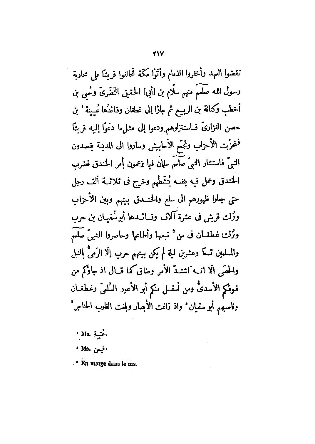 نقضوا العهد واخفروا الذمام وأتوا مكة فحالفوا قريشا على محاربة رسول الله صلى الله عليه وسلم منهم سلّام بن [أبى] الحقيق النضرىّ وحيي بن أخطب وكنانة بن الربيع ثم جاءوا إلى غطفان وقائدها عيينة [1] بن حصن الفزاري فاستنزلوهم ودعوا إلى مثل ما دعوا إليه قريشا فتحزبت الأحزاب وتجمع الأحابيش وساروا إلى المدينة يقصدون النبيّ فاستشار النبيّ صلى الله عليه وسلم سلمان فيما يزعمون بأمر الخندق فضرب الخندق وعمل فيه بنفسه ينشطهم وخرج في ثلاثة ألف رجل حتى جعلوا ظهورهم إلى سلع والخندق بينهم وبين الأحزاب ونزلت قريش في عشرة آلاف وقائدها أبو سفيان بن حرب ونزلت غطفان في من [2] تبعها وأطاعها وحاصروا النبي صلى الله عليه وسلم والمسلمين تسعا وعشرين ليلة لم يكن بينهم حرب إلا الرمي بالنبل والحصى إلا أنه اشتدّ الأمر وضاق كما قال إذ جاءوكم من فوقكم الأسديّ ومن أسفل منكم أبو الأعور السلمىّ وغطفان وناصبهم أبو سفيان وإذ زاغت الأبصار وبلغت القلوب الحناجر [3]
