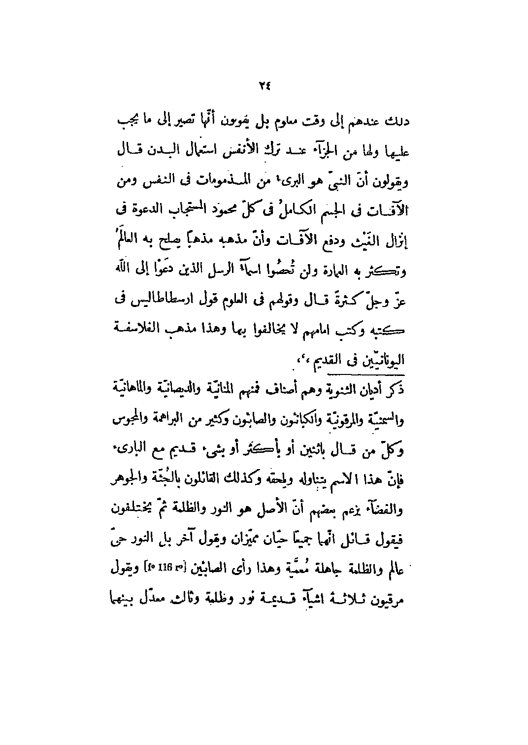 وهم أصناف فمنهم المنانية والديصانية والماهانية والسمنية والمرقونية والكبانئون والصابئون وكثير من البراهمة والمجوس وكلّ من قال باثنين أو بأكثر أو بشيء قديم مع البارئ فإن هذا الاسم يتناوله ويلحقه وكذلك القائلون بالجثة والجوهر والفضاء يزعم بعضهم أن الأصل هو النور والظلمة ثم يختلفون فيقول قائل إنهما جميعا حيان مميزان ويقول آخر بل النور حي عالم والظلمة جاهلة معمية وهذا رأي الصابئين [F 116 R] ويقول مرقيون ثلاثة أشياء قديمة نور وظلمة وثالث معدل بينهما