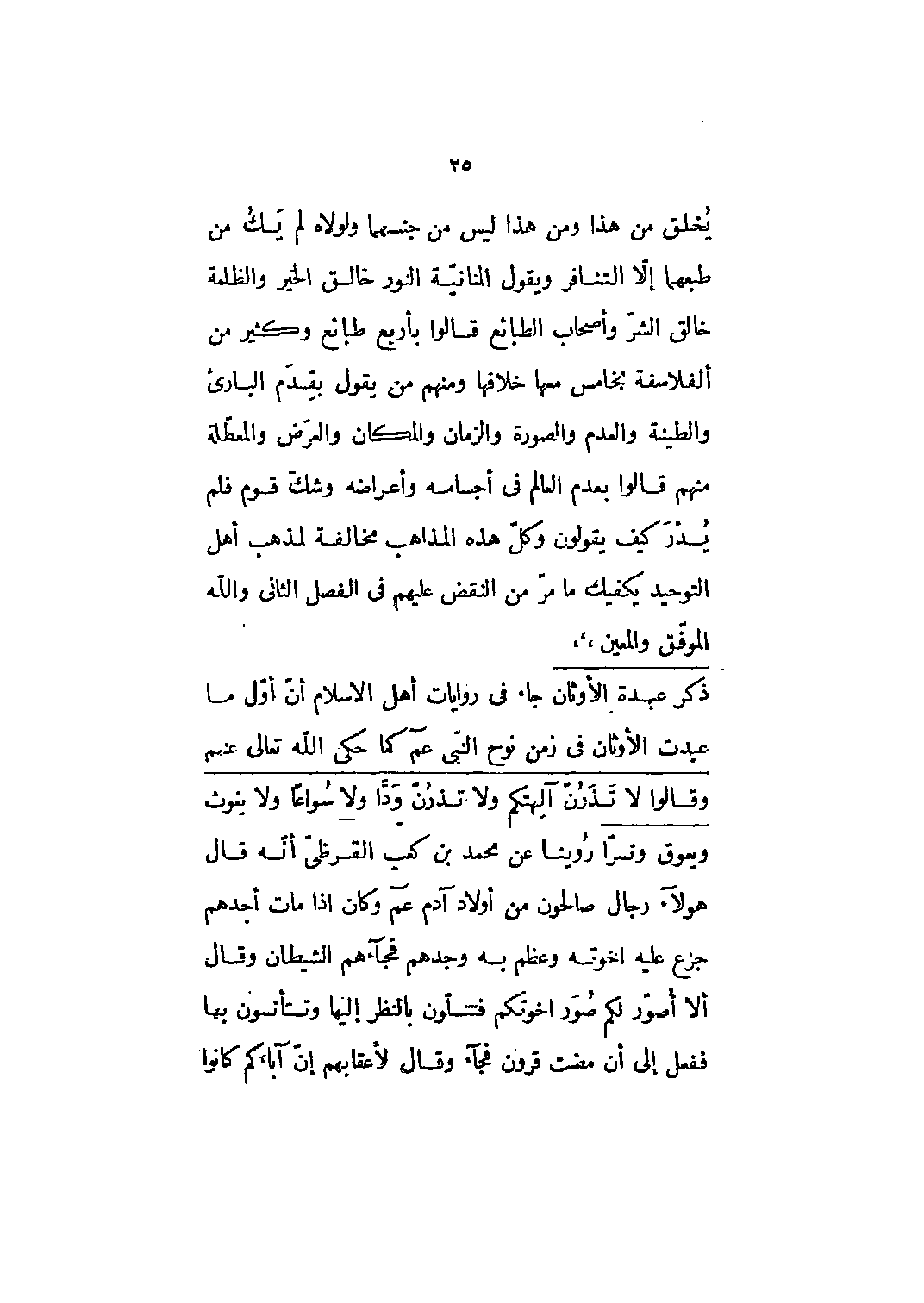 يخلق من هذا ومن هذا ليس من جنسهما ولولاه لم يك من طبعهما إلا التنافر ويقول المنانية النور خالق الخير والظلمة خالق الشر وأصحاب الطبائع قالوا بأربع طبائع وكثير من الفلاسفة بخامس معها خلافها ومنهم من يقول بقدم الباري والطينة والعدم والصورة والزمان والمكان والعرض والمعطلة منهم قالوا بعدم العالم في أجسامه وأعراضه وشك قوم فلم يدر كيف يقولون وكل هذه المذاهب مخالفة لمذهب أهل التوحيد يكفيك ما مر من النقض عليهم في الفصل الثاني والله الموفق والمعين،،،