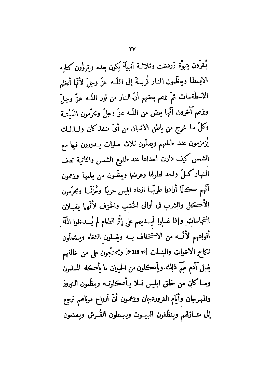 يقرون بنبوة زردشت وثلاثة أنبياء يكون بعده ويقرءون كتابه الابسطا ويعظمون النار قربة إلى الله عز وجل لأنها أعظم الاسطقسات ثم يزعم بعضهم أن النار من نور الله عز وجل ويزعم آخرون أنها بعض من الله عز وجل ويحرمون الميتة وكل ما خرج من باطن الإنسان من أي منفذ كان ولذلك يزمزمون عند طعامهم ويصلون ثلاث صلوات يدورون فيها مع الشمس كيف دارت احداها عند طلوع الشمس والثانية نصف النهار كل واحد لطولها وعرضها ويعظمون من يعلمها ويزعمون أنهم كلما أرادوا طربا ازداد ابليس حربا وحزنا ويحرمون الأكل والشرب في أواني الخشب والخزف لأنهما يقبلان النجاسات وإذا غسلوا أيديهم على إثر الطعام لم يدخلوا الماء أفواههم لأنه من الاستخفاف به ويغسلون الشفاه ويستحلون نكاح الأخوات والبنات [F 116 [؟]] ويحتجون على من خالفهم بفعل آدم عم ذلك ويأكلون من الحيوان ما يأكله المسلمون وما كان من خلق ابليس فلا يأكلونه ويعظمون النيروز والمهرجان وأيام الفروردجان ويزعمون أن أرواح موتاهم ترجع إلى منازلهم وينظفون البيوت ويبسطون الفرش ويصنعون