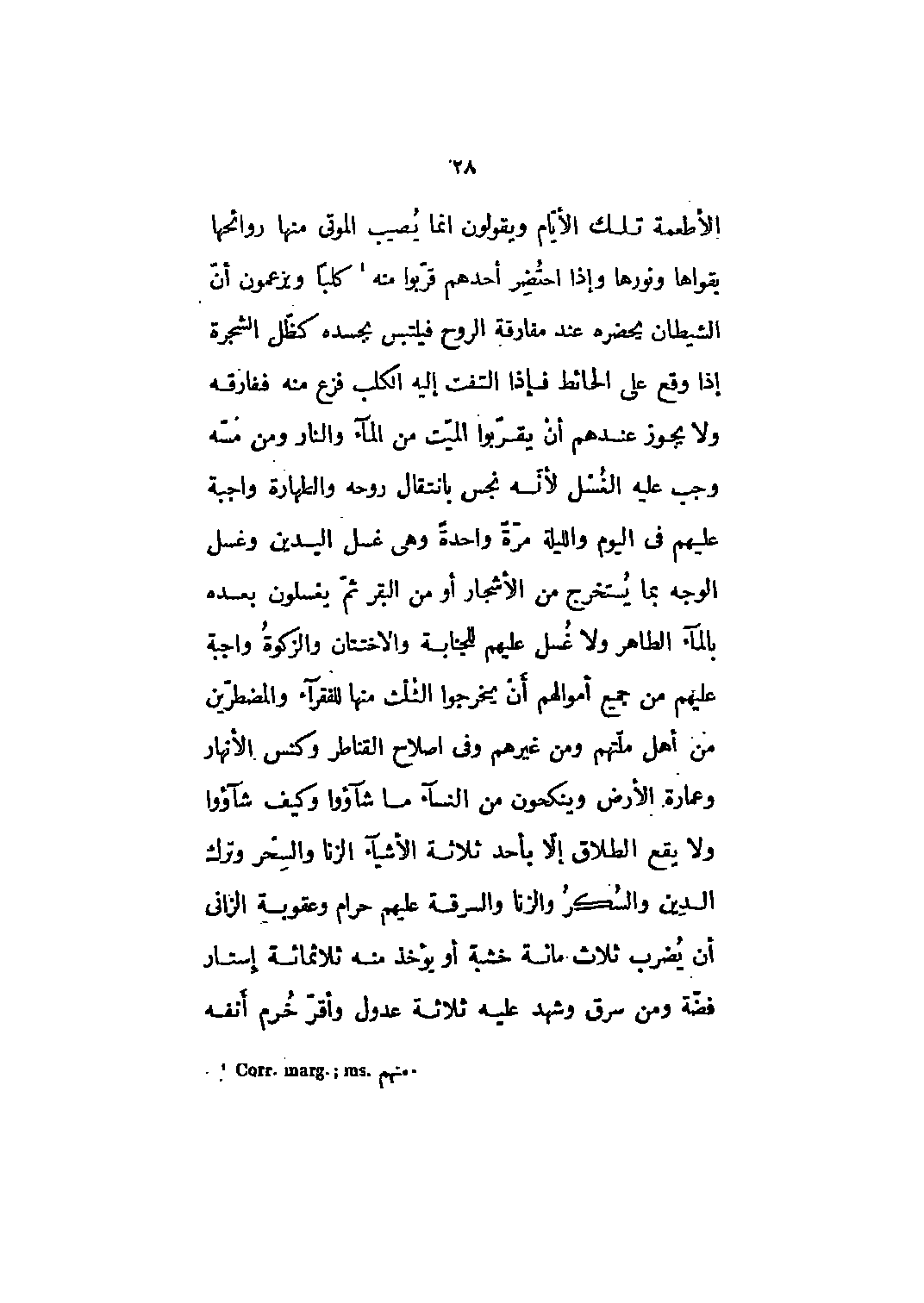 الأطعمة تلك الأيام ويقولون إنما يصيب الموتى منها روائحها بقواها ونورها وإذا احتضر أحدهم قربوا منه [1] كلبا ويزعمون أن الشيطان يحضره عند مفارقة الروح فيلتبس بجسده كظل الشجرة إذا وقع على الحائط فإذا التفت إليه الكلب فزع منه ففارقه ولا يجوز عندهم أن يقربوا الميت من الماء والنار ومن مسه وجب عليه الغسل لأنه نجس بانتقال روحه والطهارة واجبة عليهم في اليوم والليلة مرة واحدة وهي غسل اليدين وغسل الوجه بما يستخرج من الأشجار أو من البقر ثم يغسلون بعده بالماء الطاهر ولا غسل عليهم للجنابة والاختتان والزكاة واجبة عليهم من جميع أموالهم أن يخرجوا الثلث منها للفقراء والمضطرين من أهل ملتهم ومن غيرهم وفي إصلاح القناطر وكنس الأنهار وعمارة الأرض وينكحون من النساء ما شاءوا وكيف شاءوا ولا يقع الطلاق إلّا بأحد ثلاثة الأشياء الزنا والسحر وترك الدين والسكر والزنا والسرقة عليهم حرام وعقوبة الزاني أن يضرب ثلاث مائة خشبه أو يؤخذ منه ثلاثمائة إستار فضة ومن سرق وشهد عليه ثلاثة عدول وأقرّ خرم أنفه