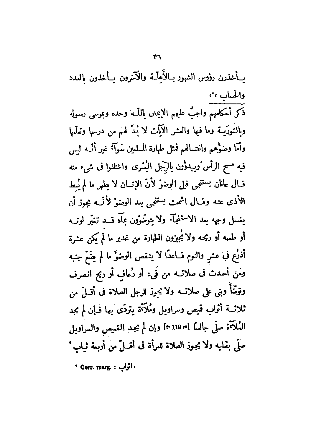 واجب عليهم الإيمان باللَّه وحده وبموسى رسوله وبالتوراة وما فيها والعشر الآيات لا بد لهم من درسها وتعلمها وأما وضوؤهم واغتسالهم فمثل طهارة المسلمين سواء غير أنه ليس فيه مسح الرأس ويبدءون بالرجل اليسرى واختلفوا في شيء منه قال عانان يستنجي قبل الوضوء لأن الإنسان لا يطهر ما لم يمط الأذى عنه وقال اشمعث يستنجى بعد الوضوء لأنّه يجوز أن يغسل وجهه بعد الاستنجاء ولا يتوضّئون بماء قد تغير لونه أو طعمه أو ريحه ولا يجيزون الطهارة من غدير ما لم يكن عشرة أذرع في عشر والنوم قاعدا لا ينقص الوضوء ما لم يضع جنبه ومن أحدث في صلاته من قيء أو رعاف أو ريح انصرف وتوضأ وبنى على صلاته ولا يجوز للرجل الصلاة في أقل من ثلاثة أثواب قميص وسراويل وملاءة يتردى بها فإن لم يجد الملاءة صلى جالسا [F 118 r] وإن لم يجد القميص والسراويل صلى بقلبه ولا يجوز الصلاة للمرأة في أقلّ من أربعة ثياب [1]