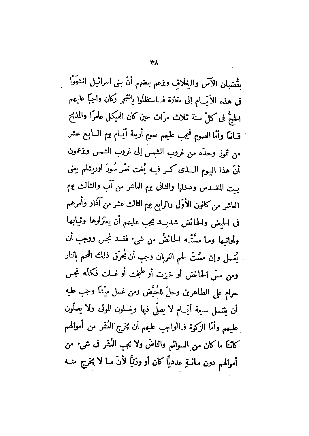 بقضبان الآس والخلاف ويزعم بعضهم أن بني إسرائيل انتهوا في هذه الأيام إلى مفازة فاستظلوا بالشجر وكان واجبا عليهم الحج في كل سنة ثلاث مرات حين كان الهيكل عامرا والمذبح قائما وأما الصوم فيجب عليهم صوم أربعة أيام يوم السابع عشر من تموز وحده من غروب الشمس إلى غروب الشمس ويزعمون أن هذا اليوم الذي كسر فيه بخت نصّر سور أوريشلم يعني بيت المقدس ودخلها والثاني يوم العاشر من آب والثالث يوم العاشر من كانون الأول والرابع يوم الثالث عشر من آذار وأمرهم في الحيض والحائض شديد يجب عليهم أن يعتزلوها وثيابها وأوانيها وما مسته الحائض من شيء فقد نجس ووجب أن يغسل وإن مست لحم القربان وجب أن يحرق ذلك اللحم بالنار ومن مس الحائض أو خبزت أو طبخت أو غسلت فكله نجس حرام على الطاهرين وحل للحيض ومن غسل ميتا وجب عليه أن يغتسل سبعة أيّام لا يصلي فيها ويغسلون الموتى ولا يصلون عليهم وأمّا الزكاة فالواجب عليهم أن يخرج العشر من أموالهم كائنا ما كان من السوائم والناض ولا يجب العشر في شيء من أموالهم دون مائة عدديا كان أو وزنيا لأن ما لا يخرج منه