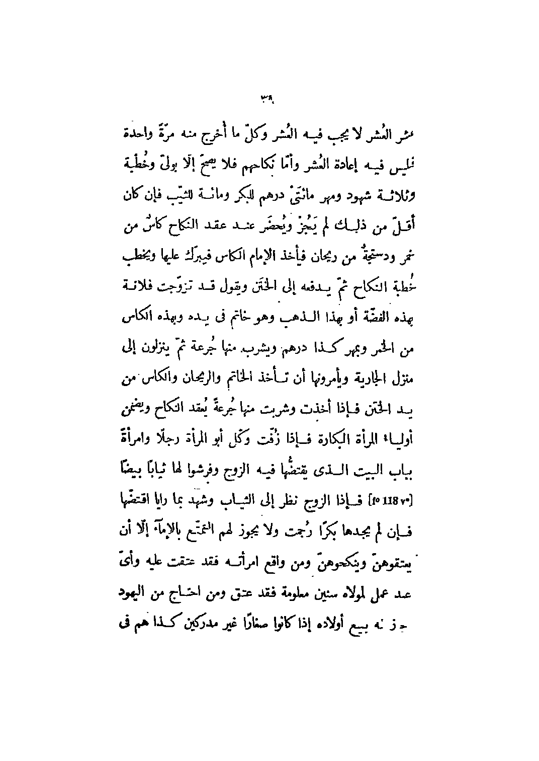 عشر العشر لا يجب فيه العشر وكل ما أخرج منه مرة واحدة فليس فيه إعادة العشر وأما نكاحهم فلا يصح إلا بولىّ وخطبة وثلاثة شهود ومهر مائتي درهم للبكر ومائة للثيب فإن كان أقل من ذلك لم يجز ويحضر عند عقد النكاح كاس من خمر ودستجة من ريحان فيأخذ الإمام الكاس فيبرك عليها ويخطب خطبة النكاح ثم يدفعه إلى الختن ويقول قد تزوجت فلانة بهذه الفضة أو بهذا الذهب وهو خاتم في يده وبهذه الكاس من الخمر وبمهر كذا درهم ويشرب منها جرعة ثم ينزلون إلى منزل الجارية ويأمرونها أن تأخذ الخاتم والريحان والكاس من يد الختن فإذا أخذت وشربت منها جرعة يعقد النكاح ويضمن أولياء المرأة البكارة فإذا زفت وكل أبو المرأة رجلا وامرأة بباب البيت الذي يقتضها فيه الزوج وفرشوا لها ثيابا بيضا [F 118 v] فإذا الزوج نظر إلى الثياب وشهد بما رايا اقتضها فإن لم يجدها بكرا رجمت ولا يجوز لهم التمتع بالإماء إلا أن يعتقوهن وينكحوهن ومن واقع امرأته فقد عتقت عليه وأيّ عند عمل لمولاه سنين معلومة فقد عتق ومن احتاج من اليهود [؟] بيع أولاده إذا كانوا صغارا غير مدركين كذا هم في