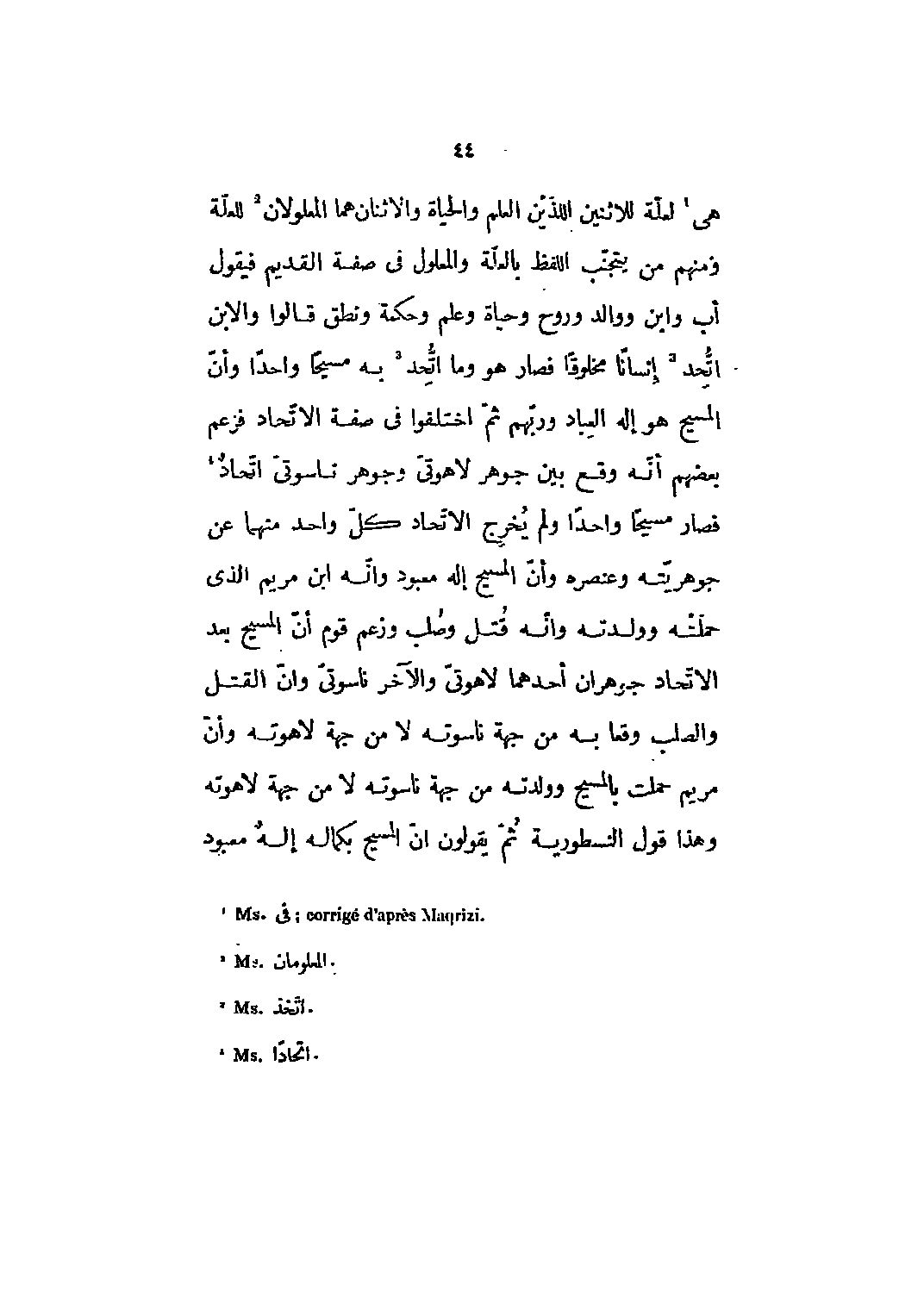 هي [1] لعلة للاثنين اللذين العلم والحياة والاثنان هما المعلولان [2] للعلة ومنهم من يتجنب اللفظ بالعلة والمعلول في صفة القديم فيقول أب وابن ووالد وروح وحياة وعلم وحكمة ونطق قالوا والابن اتّحد [3] إنسانا مخلوقا فصار هو وما اتحد [3] به مسيحا واحدا وأن المسيح هو إله العباد وربهم ثم اختلفوا في صفة الاتحاد فزعم بعضهم أنه وقع بين جوهر لاهوتي وجوهر ناسوتي اتحاد [4] فصار مسيحا واحدا ولم يخرج الاتحاد كل واحد منهما عن جوهريته وعنصره وأن المسيح إله معبود وأنه ابن مريم الذي حملته وولدته وأنه قتل وصلب وزعم قوم أن المسيح بعد الاتحاد جوهران أحدهما لاهوتي والآخر ناسوتي وأن القتل والصلب وقعا به من جهة ناسوته لا من جهة لاهوته وأن مريم حملت بالمسيح وولدته من جهة ناسوته لا من جهة لاهوته وهذا قول النسطورية ثم يقولون أن المسيح بكماله إله معبود