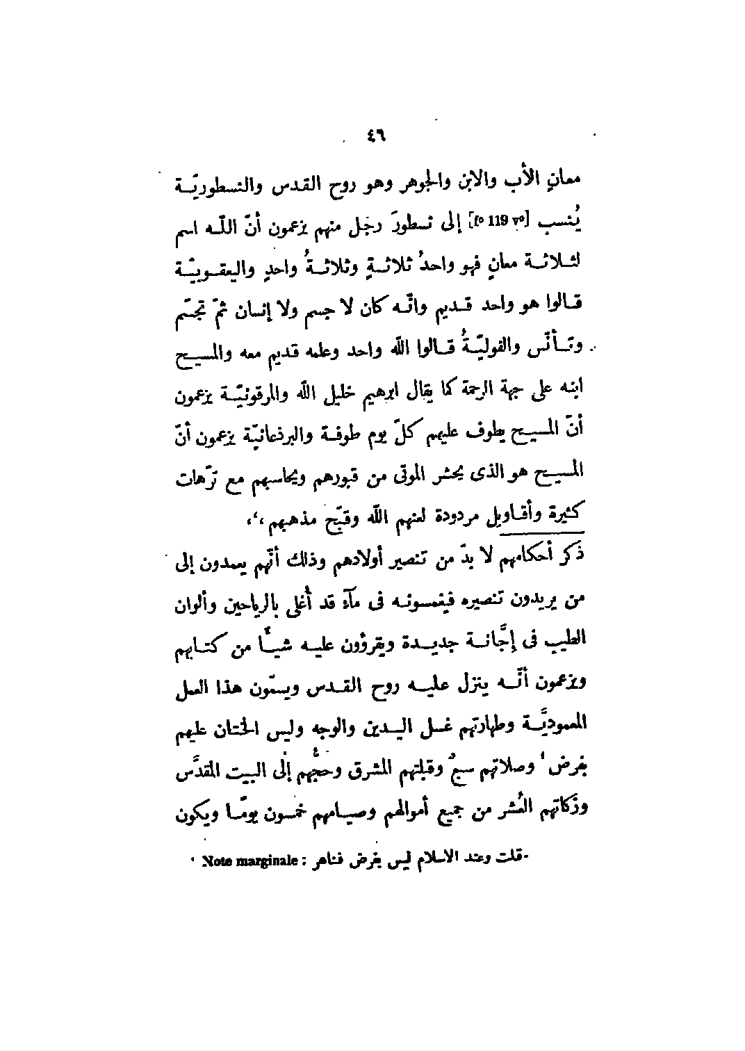 معان الأب والابن والجوهر وهو روح القدس والنسطورية ينسب [F 119 v] إلى نسطور رجل منهم يزعمون أن الله اسم لثلاثة معان فهو واحد ثلاثة وثلاثة واحد واليعقوبية قالوا هو واحد قديم وأنه كان لا جسم ولا إنسان ثم تجسم وتأنس والفولية قالوا الله واحد وعلمه قديم معه والمسيح ابنه على جهة الرحمة كما يقال إبراهيم خليل الله والمرقونية يزعمون أن المسيح يطوف عليهم كل يوم طوفة والبرذعانية يزعمون أن المسيح هو الذي يحشر الموتى من قبورهم ويحاسبهم مع ترهات كثيرة وأقاويل مردودة لعنهم الله وقبح مذهبهم،،،