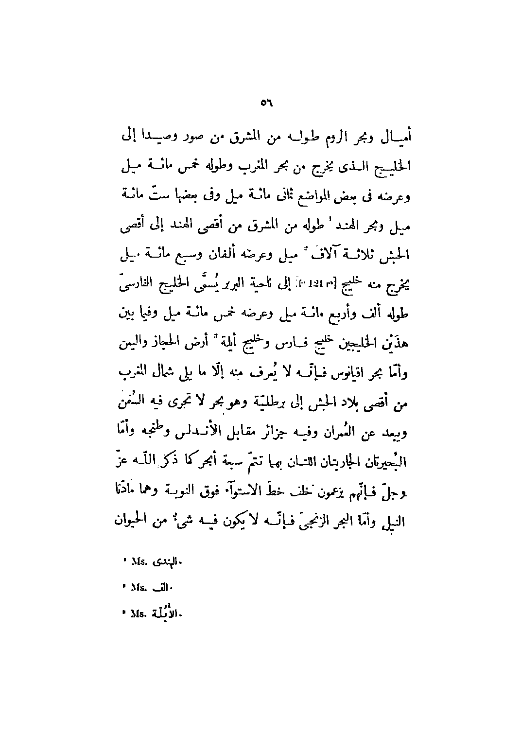 أميال وبحر الروم طوله من المشرق من صور وصيدا 7 لي الخليج الذي يخرج من بحر المغرب وطوله خمس مائة ميل وعرضه في بعض المواضع ثماني مائة ميل وفي بعضها ست مائة ميل وبحر الهند [1] طوله من المشرق من أقصى الهند إلى أقصى الحبش ثلاثة آلاف [2] ميل وعرضه ألفان وسبع مائة ميل يخرج منه خليج [F 121 r] إلى ناحية البربر يسمى الخليج الفارسي طوله ألف وأربع مائة ميل وعرضه خمس مائة ميل وفيما بين هذين الخليجين خليج فارس وخليج أيلة [3] أرض الحجاز واليمن وأمّا بحر اقيانوس فإنه لا يعرف منه إلا ما يلي شمال المغرب من أقصى بلاد الحبش إلى برطليّة وهو بحر لا تجرى فيه السفن ويبعد عن العمران وفيه جزائر مقابل الأندلس وطنجة وأما البحيرتان الجاريتان اللتان بهما تتم سبعة أبحر كما ذكر الله عز وجل فإنهم يزعمون خلف خط الاستواء فوق النوبة وهما مادتا النيل وأما البحر الزنجي فإنه لا يكون فيه شيء من الحيوان