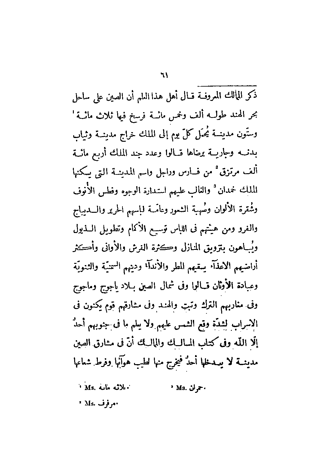 قال أهل هذا العلم أن الصين على ساحل بحر الهند طوله ألف وخمس مائة فرسخ فيها ثلاث مائة [1] وستون مدينة يحمل كل يوم إلى الملك خراج مدينة وثياب بدنه وجارية يرضاها قالوا وعدد جند الملك أربع مائة ألف مرتزق [2] من فارس وراجل واسم المدينة التي يسكنها الملك خمدان [3] والغالب عليهم استدارة الوجوه وفطس الأنوف وشقرة الألوان وصهبة الشعور وعامة لباسهم الحرير والديباج والفرو ومن هيئتهم في اللباس توسيع الأكمام وتطويل الذيول ويباهون بتزويق المنازل وكثرة الفرش والأواني وأكثر أراضيهم الاعذاء يسقيهم المطر والأنداء ودينهم السمنيّة والثنويّة وعبادة الأوثان قالوا وفي شمال الصين بلاد يأجوج ومأجوج وفي مغاربهم الترك وتبت والهند وفي مشارقهم قوم يكنون في الأسراب لشدة وقع الشمس عليهم ولا يعلم ما في جنوبهم أحد إلا الله وفي كتاب المسالك والممالك أن في مشارق الصين مدينة لا يدخلها أحد فيخرج منها لطيب هوائها وفرط شعاعها