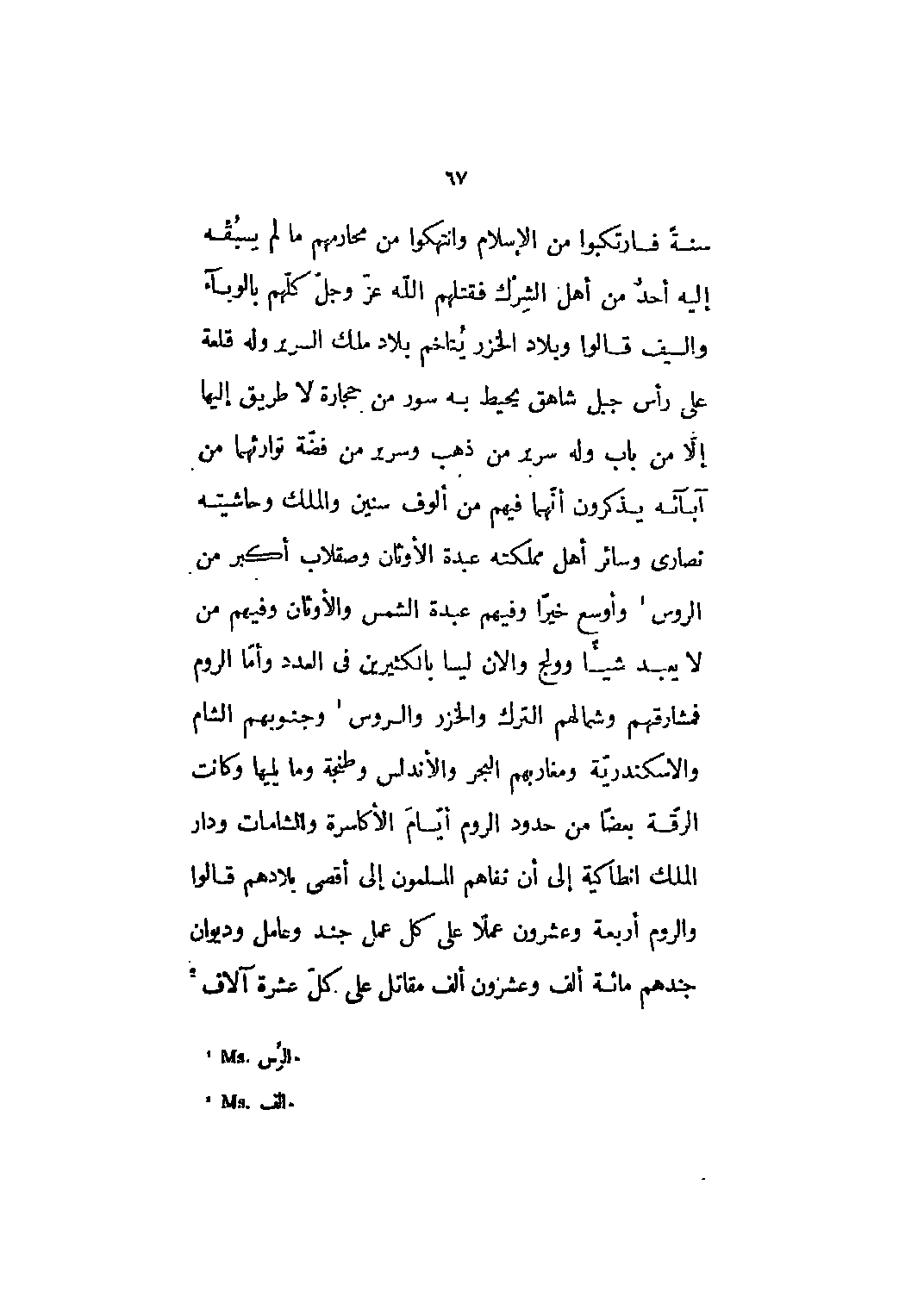 سنة فارتكبوا من الإسلام وانتهكوا من محارمهم ما لم يسبقه إليه أحد من أهل الشرك فقتلهم الله عز وجل كلهم بالوباء والسيف قالوا وبلاد الخزر يتاخم بلاد ملك السرير وله قلعة على رأس جبل شاهق يحيط به سور من حجارة لا طريق إليها إلا من باب وله سرير من ذهب وسرير من فضة توارثهما من آبائه يذكرون أنهما فيهم من ألوف سنين والملك وحاشيته نصارى وسائر أهل مملكته عبدة الأوثان وصقلاب أكبر من الروس [1] وأوسع خيرا وفيهم عبدة الشمس والأوثان وفيهم من لا يعبد شيئا وولج والان ليسا بالكثيرين في العدد وأما الروم فمشارقهم وشمالهم الترك والخزر والروس [1] وجنوبهم الشام والاسكندرية ومغاربهم البحر والأندلس وطنجة وما يليها وكانت الرقة بعضا من حدود الروم أيام الأكاسرة والشامات ودار الملك انطاكية إلى أن نفاهم المسلمون إلى أقصى بلادهم قالوا والروم أربعة وعشرون عملا على كل عمل جند وعامل وديوان جندهم مائة ألف وعشرون ألف مقاتل على كلّ عشرة آلاف [2]