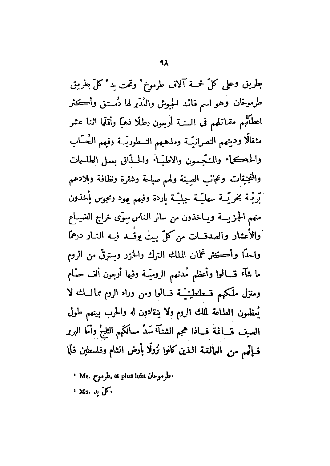 بطريق وعلى كل خمسة آلاف طرموخ [1] وتحت يد [2] كل بطريق طرموخان وهو اسم قائد الجيوش والمدبر لها دمستق وأكثر اعطائهم مقاتلهم في السنة أربعون رطلا ذهبا وأقلها اثنا عشر مثقالا ودينهم النصرانيّة ومذهبهم النسطوريّة وفيهم الحساب والحكماء والمنجمون والأطباء والحذاق بعمل الطلسمات والمنجنيقات وعجائب الصيغة ولهم صباحة وشقرة ونظافة وبلادهم برية بحرية سهلية جبلية باردة وفيهم يهود ومجوس يأخذون منهم الجزية ويأخذون من سائر الناس سوى خراج الضياع والأعشار والصدقات من كل بيت يوقد فيه النار درهما واحدا وأكثر غلمان الملك الترك والخزر ويسترق من الروم ما شاء قالوا وأعظم مدنهم الرومية وفيها أربعون ألف حمام ومنزل ملكهم قسطنطينية قالوا ومن وراء الروم ممالك لا يعظمون الطاعة لملك الروم ولا ينقادون له والحرب بينهم طول الصيف قائمة فإذا هجم الشتاء سد مسالكهم الثلج وأما البربر فإنهم من العمالقة الذين كانوا نزولا بأرض الشام وفلسطين فلمّا