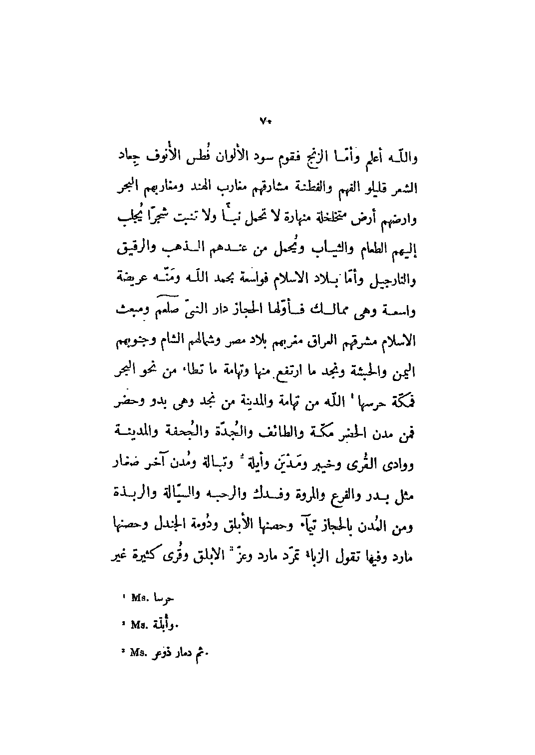 والله أعلم وأما الزنج فقوم سود الألوان فطس الأنوف جعاد الشعر قليلو الفهم والفطنة مشارقهم مغارب الهند ومغاربهم البحر وأرضهم أرض متخلخلة منهارة لا تحمل نبأ ولا تنبت شجرا يجلب إليهم الطعام والثياب ويحمل من عندهم الذهب والرقيق والنارجيل وأما بلاد الإسلام فواسعة بحمد الله ومنه عريضة واسعة وهي ممالك فأوّلها الحجاز دار النبيّ صلى الله عليه وسلم ومبعث الإسلام مشرقهم العراق مغربهم بلاد مصر وشمالهم الشام وجنوبهم اليمن والحبشة ونجد ما ارتفع منها وتهامة ما تطأ من نحو البحر فمكة حرسها [1] الله من تهامة والمدينة من نجد وهي بدو وحضر فمن مدن الحضر مكة والطائف والجدة والجحفة والمدينة ووادي القرى وخيبر ومدين وأيلة [2] وتبالة ومدن آخر صغار مثل بدر والفرع والمروة وفدك والرحبة والسيالة والرَّبَذَة ومن المدن بالحجاز تيماء وحصنها الأبلق ودومة الجندل وحصنها مارد وفيها تقول الزباء تمرّد مارد وعزّ [3] الأبلق وقرى كثيرة غير