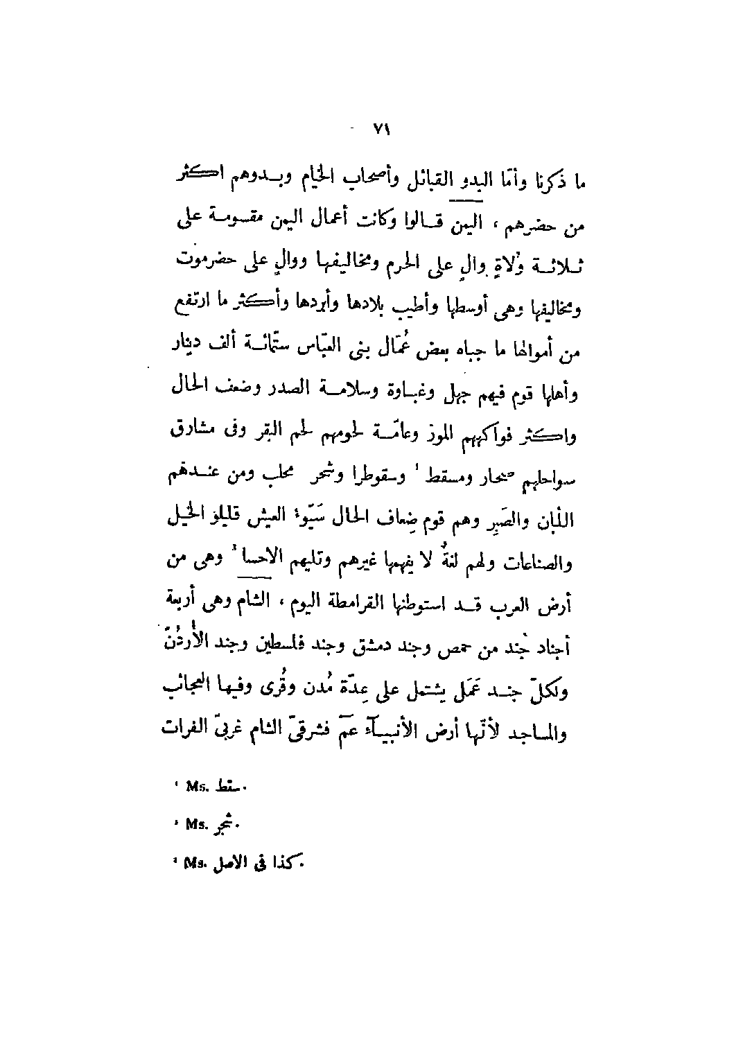 قالوا وكانت أعمال اليمن مقسومة على ثلاثة ولاة وال على الحرم ومخاليفها ووال على حضرموت ومخاليفها وهي أوسطها وأطيب بلادها وأبردها وأكثر ما ارتفع من أموالها ما جباه بعض عمّال بنى العبّاس ستّمائة ألف دينار وأهلها قوم فيهم جهل وغباوة وسلامة الصدر وضعف الحال وأكثر فواكههم الموز وعامة لحومهم لحم البقر وفي مشارق سواحلهم صخار ومسقط [1] وسقوطرا وشحر [2] محلب ومن عندهم اللبان والصبر وهم قوم ضعاف الحال سيّئو العيش قليلو الخيل والصناعات ولهم لغة لا يفهمها غيرهم وتليهم الاحسا [3] وهي من أرض العرب قد استوطنها القرامطة اليوم،