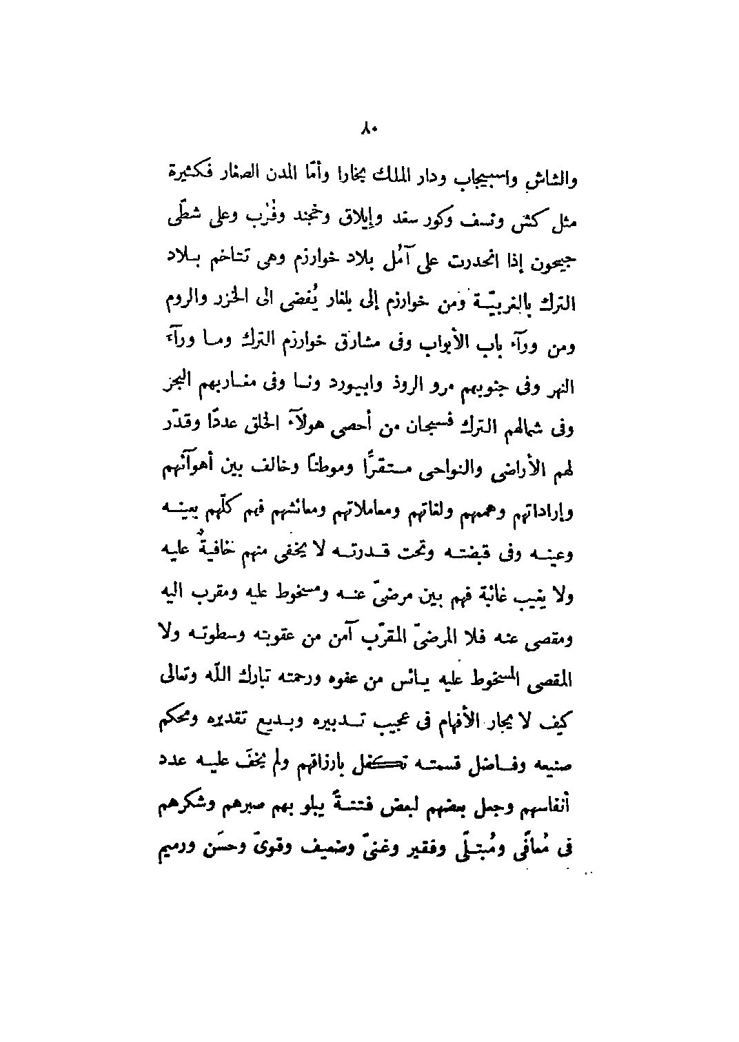والشاش وأسبيجاب ودار الملك بخارا وأما المدن الصغار فكثيرة مثل كش ونسف وكور سغد وإيلاق وخجند وفرب وعلى شطى جيحون إذا انحدرت على آمل بلاد خوارزم وهي تتاخم بلاد الترك بالغربية ومن خوارزم إلى بلغار يفضى إلى الخزر والروم ومن وراء باب الأبواب وفي مشارق خوارزم الترك وما وراء النهر وفي جنوبهم مروالروذ وابيورد ونسا وفي مغاربهم البحر وفي شمالهم الترك فسبحان من أحصى هؤلاء الخلق عددا وقدر لهم الأراضي والنواحي مستقرا وموطنا وخالف بين أهوائهم وإراداتهم وهممهم ولغاتهم ومعاملاتهم ومعايشهم فهم كلّهم بعينه وعينه وفي قبضته وتحت قدرته لا يخفى منهم خافية عليه ولا يغيب غائبة فهم بين مرضى عنه ومسخوط عليه ومقرب إليه ومقصى عنه فلا المرضى المقرب آمن من عقوبته وسطوته ولا المقصى المسخوط عليه يائس من عفوه ورحمته تبارك الله وتعالى كيف لا يحار الأفهام في عجيب تدبيره وبديع تقديره ومحكم صنيعه وفاضل قسمته تكفل بارزاقهم ولم يخف عليه عدد أنفاسهم وجعل بعضهم لبعض فتنة يبلو بهم صبرهم وشكرهم في معافى ومبتلى وفقير وغني وضعيف وقوي وحسن ورميم